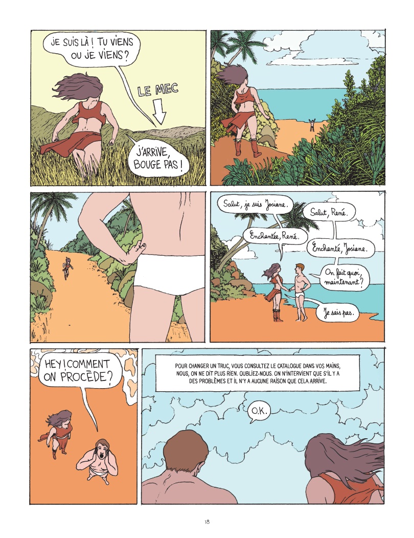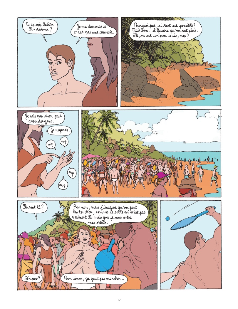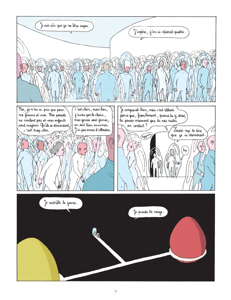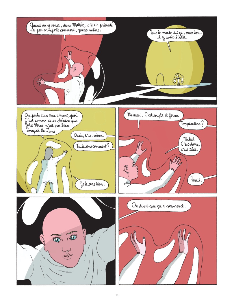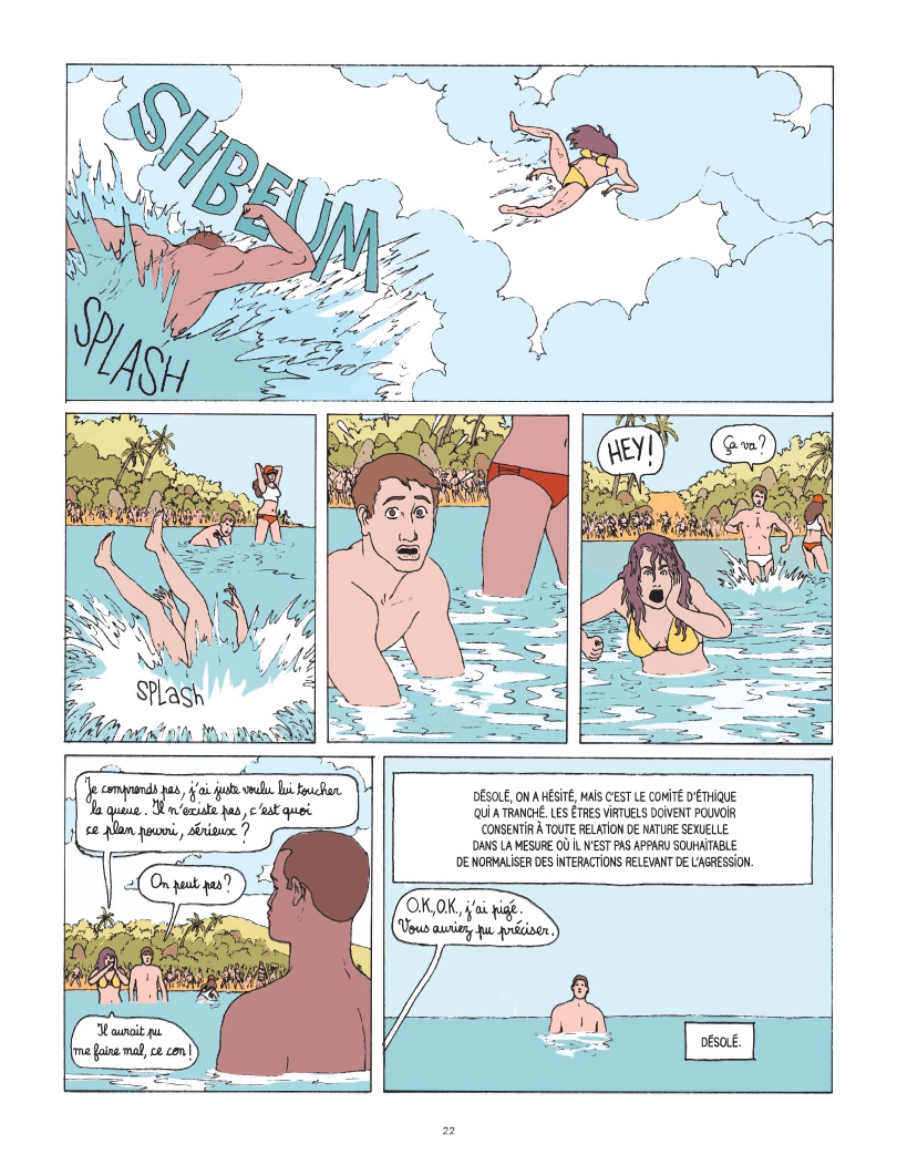 Et puisque le virtuel leur permet tout, sans transition, les paysages défilent et ont dû faire suer leur créateur graphique, aidé par la palette de Marie Galopin qui varie les tons, de la société fade quittée à l’intensité irréelle du nouveau monde (quel aquarium grandeur nature dans lequel nous sommes plongés!). De quoi nuancer l’apparente simplicité des personnages qui permet pourtant de mieux coller à leur naïveté dans ce monde paradoxal où le sensoriel est subordonné au virtuel.