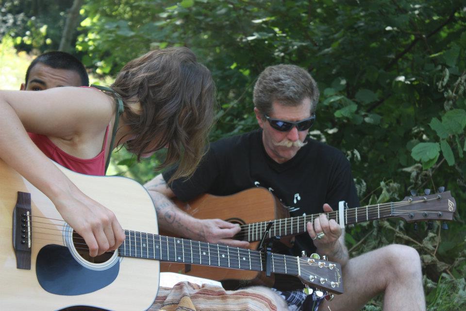 Commence un « petit aperçu » d’une heure sur tout ce que ce ‘‘guitar hero’’, révélé sur le tard, peut proposer. Forcément, ça commence par Pink Floyd et Another Brick in the wall, symbole devant l’éternel de l’enfermement à briser, Angie des Stones prend sa suite, avant Metallica. Un instant, Serge s’arrête pour écouter ce qu’il se passe dans la rue. L’école est finie et les enfants rentrent en rigolant. Un plaisir rare quand on a vécu à l’ombre de ces petits bonheurs quotidiens. Puis ce sont les inévitables et emblématiques Portes du Pénitencier de Johnny qui ouvrent un nouveau set musical. Tout y passe, Trust résolument Antisocial, un hommage à Lou Reed, Brassens, Renaud époque loubard, Elvis Presley et son Jailhouse Rock, encore et toujours la prison ; puis des chansons d’horizons, de rédemptions comme Hotel California… avant une propre composition de Serge, Ballade d’un voyou.