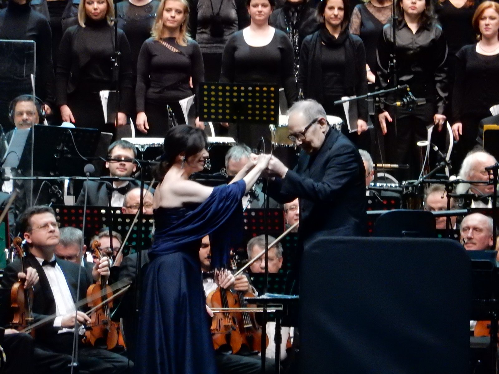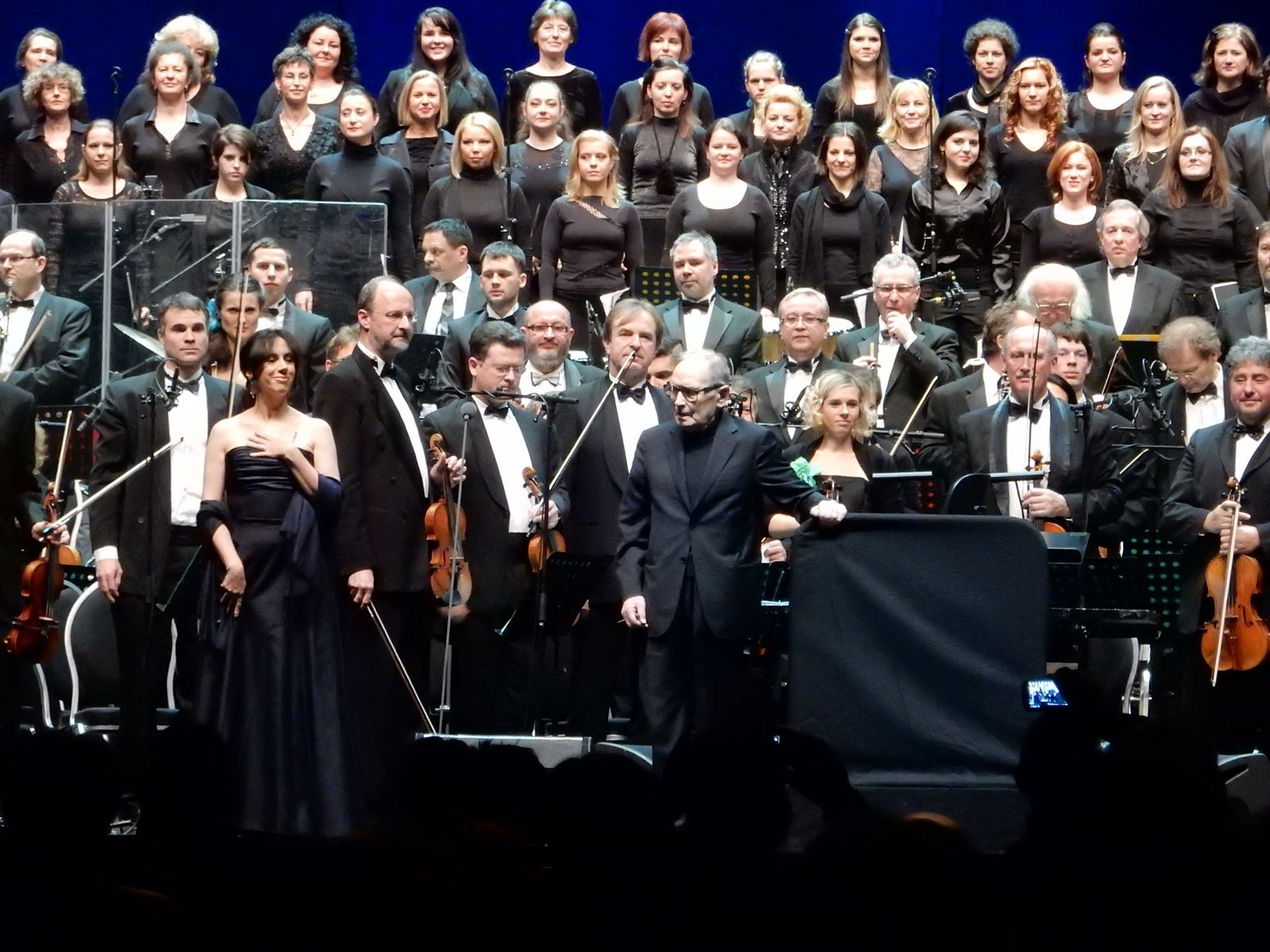 C’est dire si Ennio Morricone était attendu. Longuement attendu en Belgique. En effet, après deux reports de concert suite à des ennuis de santé et de dos, Ennio s’est présenté sur le coup de 20h30 devant un public déjà comblé aux générations confondues. Et Ennio, en plus de cette salle du Palais 12 archi-comble, n’était pas venu seul: 120 musiciens et choristes derrière lui, fidèles et soumis à la grâce de la musique du Maestro. Et quelle grâce, quelle majestuosité, quelle intensité, j’étais comme le gosse que je suis toujours un peu en entendant l’une de ses musiques. Il y en a pour tous les goûts et tous les solos d’instruments: clavier, trompette, cor, violon, guitare. Et l’aventure commence à bord du vaisseau de ce guide universel, à travers 50 ans de cinéma. Il y a les Incorruptibles pour commencer, formidable entrée en matière, puis le thème de Déborah dans Il était une fois en Amérique, l’incroyable et totalement oublié H2S fort en piano et en trompettes, gai et entraînant. Les musiques claquent et s’enchaînent entre nostalgie et intemporalité. « De la musique classique quoi?« , me direz-vous? Non pas que, avec des accents très rocks (Come Maddalena) et très synthétiques prouvant que l’homme est à la liaison des genres, conscient du passé, de son présent et du futur. Les musiques n’ont pas vieilli, et quand Ennio quitte son siège de chef d’orchestre pour se diriger vers les backstages pour y chercher la soliste et soprano absolument époustouflante Susanna Rigacci pour Le bon, la brute et le truand, les applaudissements fusent. Pareil pour l’incandescent Ecstasy of Gold.