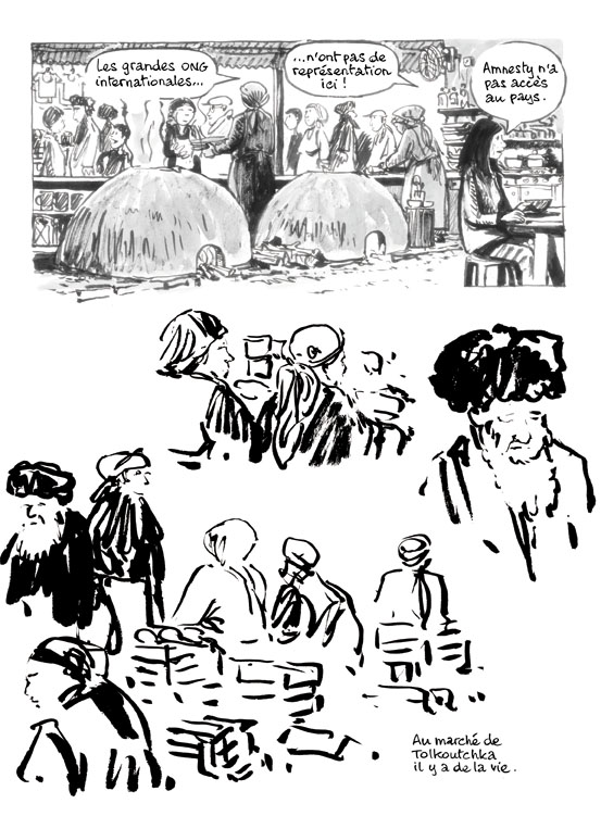 Chance aussi que Troubs est né avec un crayon dans la bouche, et non un appareil photo. En effet, la photographie est proscrite (ce qui renforce le poids du crayon pour décrire au mieux la réalité) dans ce pays de sables noirs où l’art est pensé pour ne déranger personne, ou la culture peut vivre mais dépolitisée. Finalement, pas grand chose n’a changé depuis le communisme, ou alors en mal. Sauf peut-être l’eau et l’électricité qui demeurent presque gratuites. Une réalité sensible que touche Troubs de la pointe de son crayon au gré de visa de 3 jours, de couvre-feux obligatoires et de lectures surréalistes (Le Ruhnama, livre et gloire nationale écrit par Niazov pour l’unir à son peuple et se justifier par de multiples emprunts aux textes sacrés, au communisme et aux traditions épiques nomades. Avec en plus, la volonté de s’imposer comme second livre après le Coran).