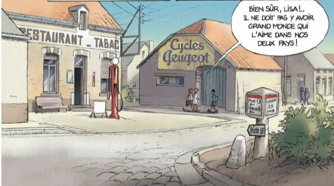 B : C’est aussi une des forces de mon dessin, tout est interprété. Dans le second tome, je dessine un Spitfire avec la plaque d’immatriculation ERS… pour la blague. Mais, je m’attends déjà à des remarques comme « Oui, mais cet avion venant de tel escadron et caractérisé par la lettre S n’était pas dans cette région. » Des petites erreurs, il y en a sans doute beaucoup, mais c’à quoi j’attache de l’importance, c’est ce restaurant-tabac, avec la pompe à essence devant, toutes ces choses qui n’existent absolument plus et qui font tout le charme et la particularité d’une époque. C’est ça qui est agréable et gai, qui permet de s’amuser et de retrouver cette ambiance.