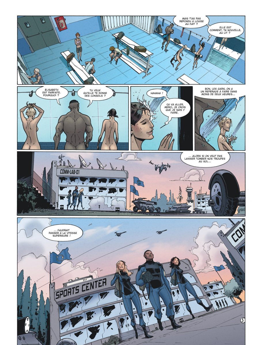 Louis, pour sa part, possède un style qui s’accorde parfaitement avec le récit de Sylvain Runberg. Un peu manga, un peu comics, un peu franco-belge, le dessinateur de Tessa, agent intergalactique, donne une réelle cohésion et une identité à Drones. Par son trait vif et sexy, Louis parvient également à insuffler de la vitesse aux scènes de combats dantesques et explosives auxquelles participent aussi, amplement, les couleurs de Véra Daviet. Bref, complètement divertissante mais proposant des enjeux contemporains et une multitude de pistes qu’on espère bien voir se développer dans le prochain épisode de ce diptyque annoncé (et sa suite?), Drones pose les bases d’un récit intéressant en tout point.