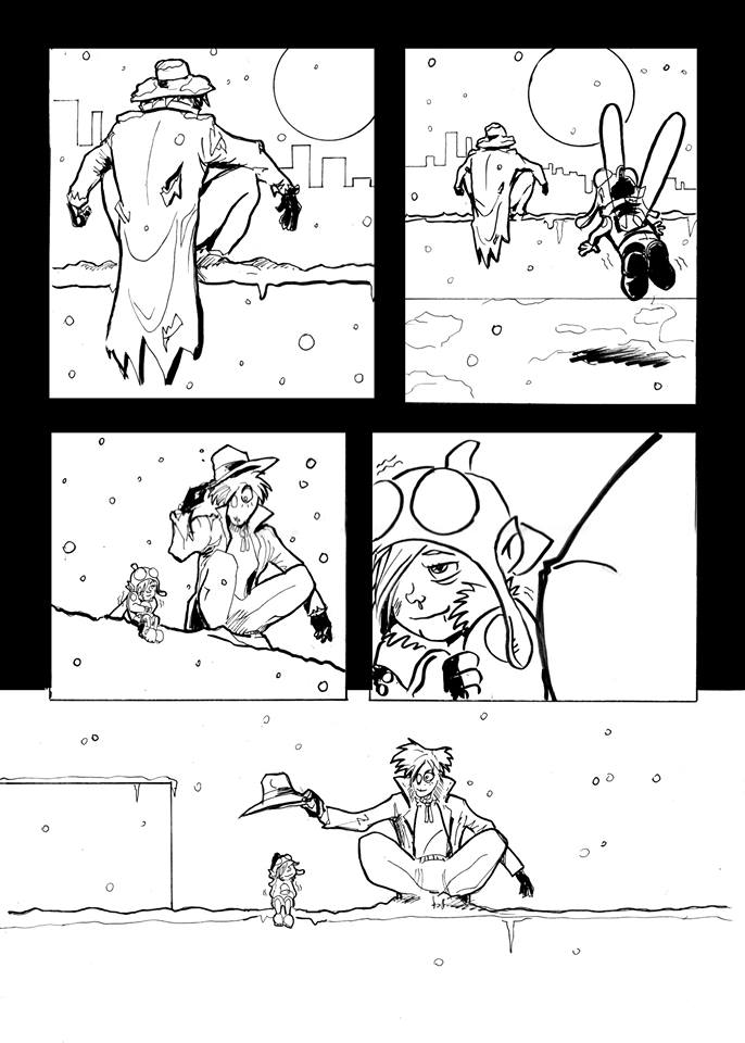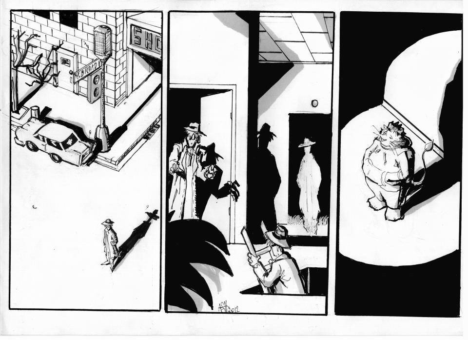 Hassan: J’utilise beaucoup la palette graphique, pour la mise en page et les couleurs. Mais je démarre toujours sur du papier (il sort ses originaux). Puis je scanne et je retravaille, je corrige sur photoshop. Ça prend du temps et c’est fastidieux, mais à la fin, on est vachement content de l’avoir fait. Mais, au départ, je préfère le crayon, le papier, et un format beaucoup plus grand que le comics. Comme on n’était pas sûr de le sortir, j’ai travaillé sur grand-format et j’ai fait toute la première histoire ainsi. Sur le numéro 2, je ne suis pas sûr que je procéderai de la même manière.