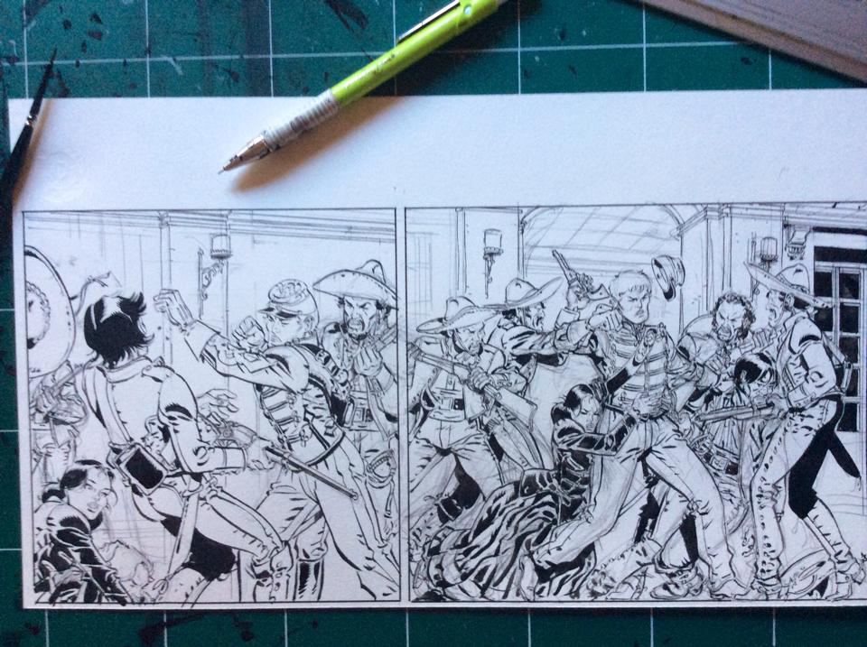 On en parle parfois. Ça serait super ! Il est très brillant et c’est vrai que j’ai appris beaucoup avec lui. Il a une perception à la fois élégante et hyper efficace de la narration et de la mise en scène. Moi qui ai démarré la bd à la trentaine passée, j’étais fasciné par la maîtrise de ce jeune qui, à 25 ans était capable de faire un western de la trempe de l’Etoile du Désert en bousculant tous les codes du genre. A la fois iconoclaste, surprenant, riche et posant les bases d’un style flamboyant toujours à l’œuvre, vingt ans après. C’est le Scorpion de la BD : virevoltant, drôle, piquant et plein d’une énergie généreuse. La grâce et le talent, quoi !