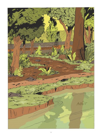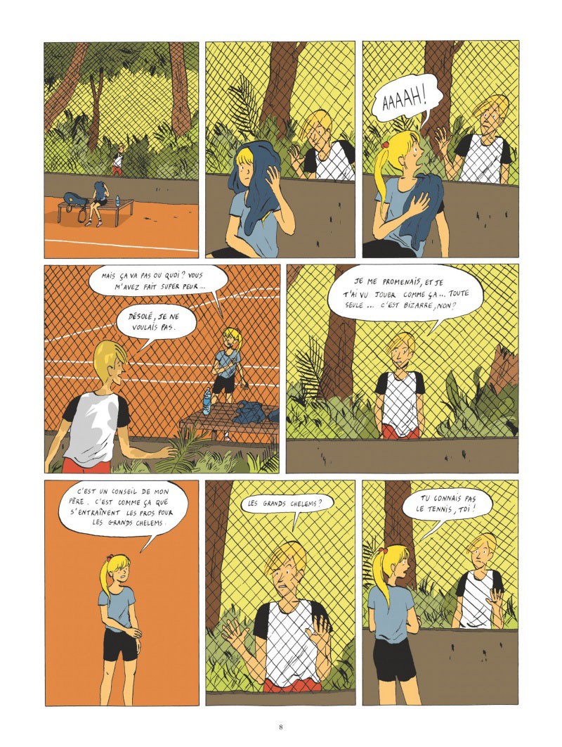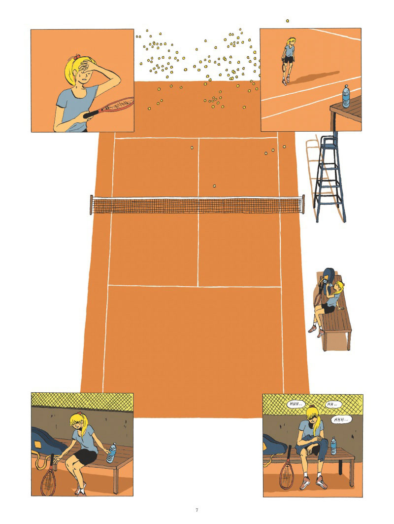 Par pur plaisir de dessin ! J’adore le tennis, du coup je voulais faire tourner mon histoire autour de ce thème. En plus, les terrains, les couleurs, les lignes, tout ça est assez graphique et peut donner un chouette truc visuellement parlant. Dès le début du projet, j’avais ces images en tête. Des terrains extérieurs, un peu délabrés, entourés par les arbres.