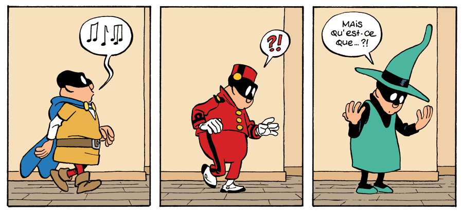 Mais ça, c’est juste l’apéritif. Car, tant qu’à bien faire les choses, Pascal Jousselin a donné à son héros d’un nouveau genre la capacité de se déplacer de case en case. « Oui, et alors ? N’est-ce pas l’apanage de n’importe quel héros de BD qui se respecte ? » Si bien sûr, mais vous ne m’avez pas compris : dans ses aventures, Imbattable s’impose comme un maître de l’espace et du temps, pouvant à son gré décider du sens de lecture mais aussi filer un coup de pied à un méchant trois cases plus loin, remonter un paquet du bas d’une planche vers son début ou, en toute maladresse, de changer le cours d’un gag ou d’une histoire… Être là où on ne l’attend pas, telle est la force, jubilatoire, de ce petit miquet masqué.