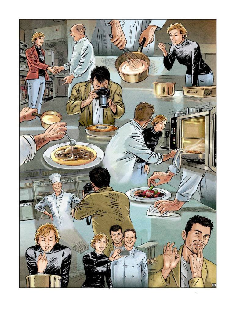 Mais trêve de divagation, les casseroles sifflent et nous rappellent à l’ordre : on a un meurtre sur les bras. Et bientôt un autre, et encore un autre. Et, habitués que nous sommes à la série des Meurtres à… diffusés sur France Télévisions, des épisodes qui rivalisent parfois de clichés et de facilité, on était en droit d’avoir un peu peur avec cet album. Il n’en est rien et l’enquête proposée par le trio se tient bien, ne relâche ni la tension ni les indices qui pourraient trop facilement nous mettre sur la piste de l’assassin. Le diable peut être à la sauce mais aussi dans les détails, et quand vient le dénouement, on se rend compte que trop occupé à saliver sur les menus proposés, on n’avait rien vu venir. Voilà un bon coup de fourchette, délicieux.