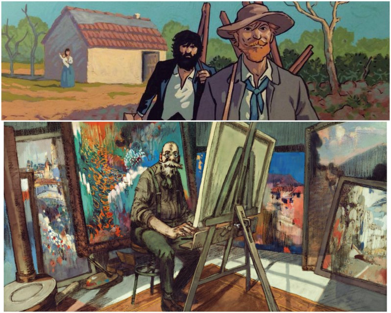 Bien sûr, dans cette biographie aux couleurs chaudes et vivantes, comme pour ramener de loin le goût des nénuphars et des impressions d’un soleil qui n’a pas fini de prendre la pose, les deux auteurs parcourent les grandes lignes de l’éternel résident de Giverny. Et dès les premières planches, l’heure est grave : trois jours de noir lui tendent les bras et lui ferment les yeux. Un insupportable noir pour un homme qui n’a eu de cesse de rechercher la plus belle des lumières, celle qui le ferait passer à la postérité et donnerait un sous-titre tout trouvé à cet album : « Nomade de la lumière ».
