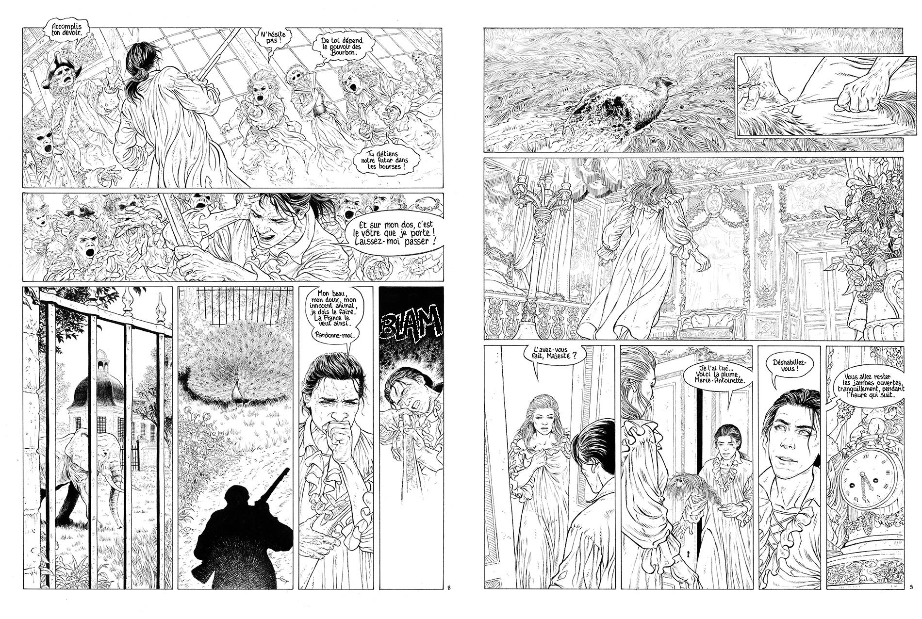Dans la première partie de ce tome, c’est dans un long flash-back habilement négocié que nous entraînent les deux surdoués Jodo et Jérémy pour mieux rattraper la grande Histoire que nous évoquions tout à l’heure. Nous voilà de nuit à Versailles entre l’apparition d’un éléphant et le sang d’un paon. Et les cris des fantômes. Tout s’enchaîne, la timidité infantile et infertile de Louis XVI, la jouissance d’une Marie-Antoinette enfin comblée, les frivolités de Louis avec Charlotte Corday, la naissance du fils tant attendu, le bonheur de courte durée avant les têtes tranchées. Et des auteurs qui jouent de coudées franches pour se détacher des éléments véridiques (le meurtre de l’héritier, ou de celui qui le remplace, est ainsi ramené en 1793 au lieu de 1795) et faire le bonheur de leur histoire en la couplant à celle de Charlotte Corday, l’assassine de… Marat.
