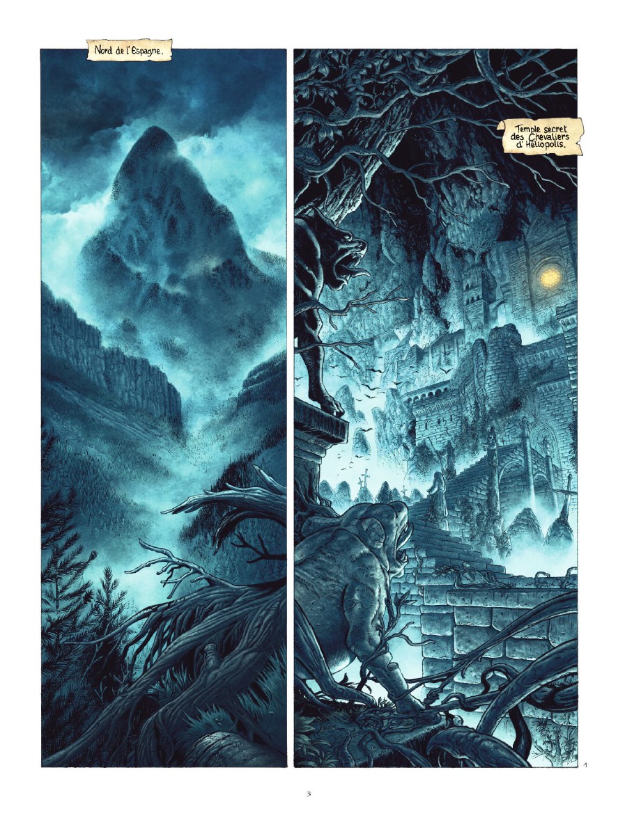 Du moins, selon la version officielle. Car dans les faits relatés par Jodo et Jérémy, c’est dans un combat démesuré face à un gorille anthropomorphe que nous retrouvons l’héritier du trône. Il a grandi, s’est musclé mais s’est surtout exilé en Espagne, parmi les Chevaliers d’Héliopolis qui, eux-mêmes, ignore tout de qui il est. Tous sauf Tadéo, l’homme à qui le Dauphin doit la vie. Et ce soir-là, début du reste de la vie d’un héritier qui va devenir chevalier, Tadéo range l’épée pour se faire conteur et dévoiler la vérité de cette histoire mystérieuse.