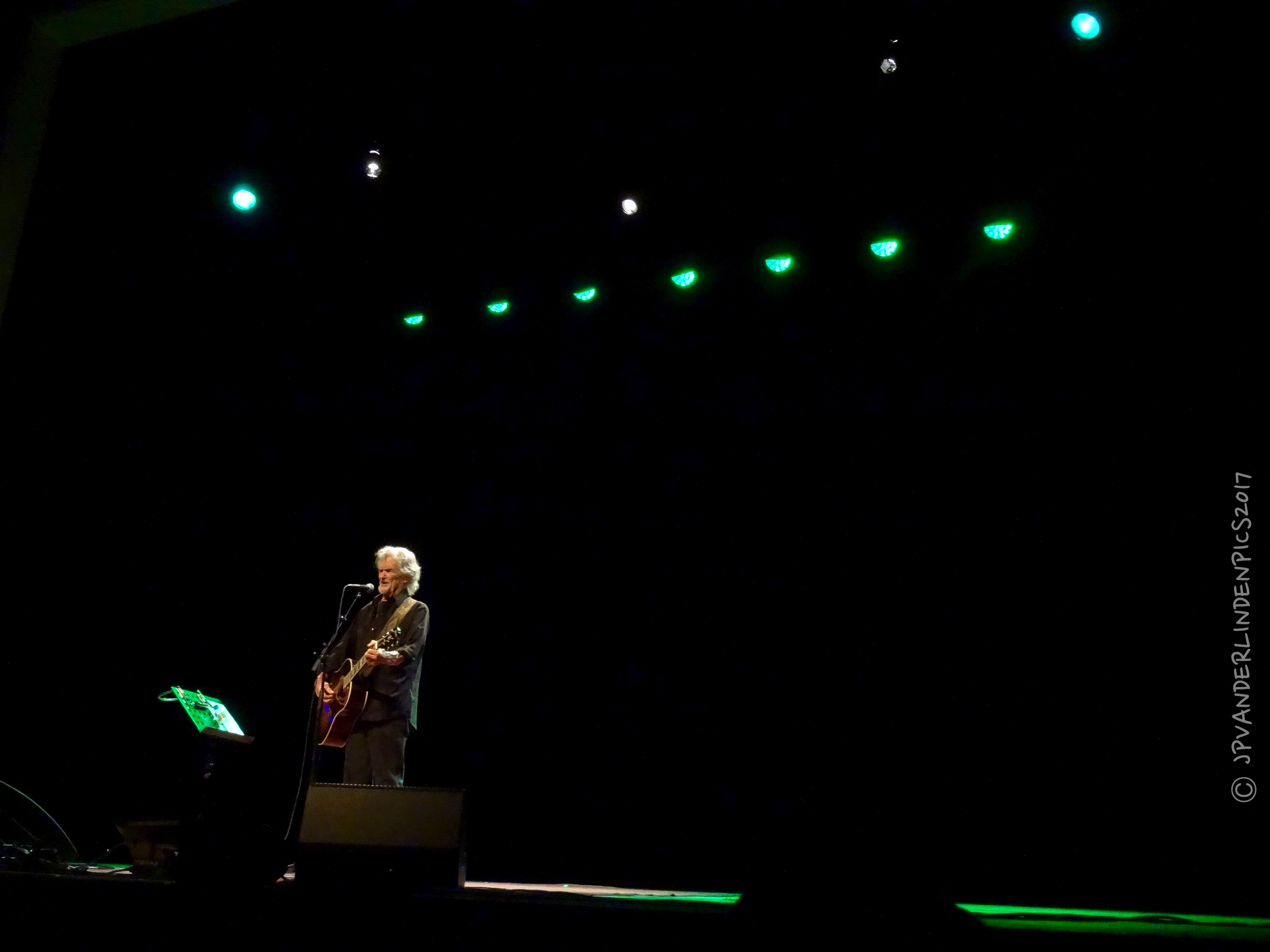 De » Me and Bobby McGee » à » Help Me Make It Through The Night » , en passant par » Here Comes That Rainbow Again » , » Living Her Was Easier » , I » ’d Rather Be Sorry » , » The Pilgrim- Chapter33 , l’hilarant » Jesus Was a Capricorn » et le magnifique » Sunday Mornin’ Comin’ Down », Kris a partagé généreusement ses magnifique chansons avec un public connaisseur et respectueux qui connaissait les paroles par coeur et frémissait à la moindre émotion. Souvent un sourire apparaissait sur son visage, et il ne manqua pas de souligner l’accueil incroyable que lui a réservé ce soir le public belge.