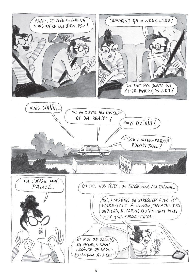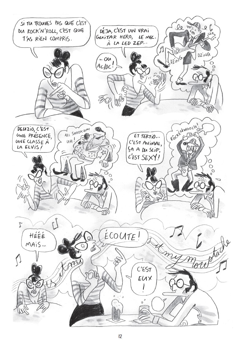 Le trait de Zoé n’a rien à envier à celui de Lefred, son papa, et se révèle explosif et dément, tout en maîtrise de son média (on ne va pas tout vous dire). Pour preuve, on pleure de rire et on en vient à se demander si ce petit roman graphique sans prétention ne serait pas l’hommage ultime à la fièvre du rock’n’roll. Si vous y ajoutez une bande-son concoctée à partir des meilleurs Tarantino (notez, du Triggerfinger, c’est très bien aussi), voilà un moment d’anthologie.