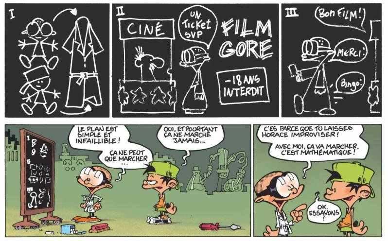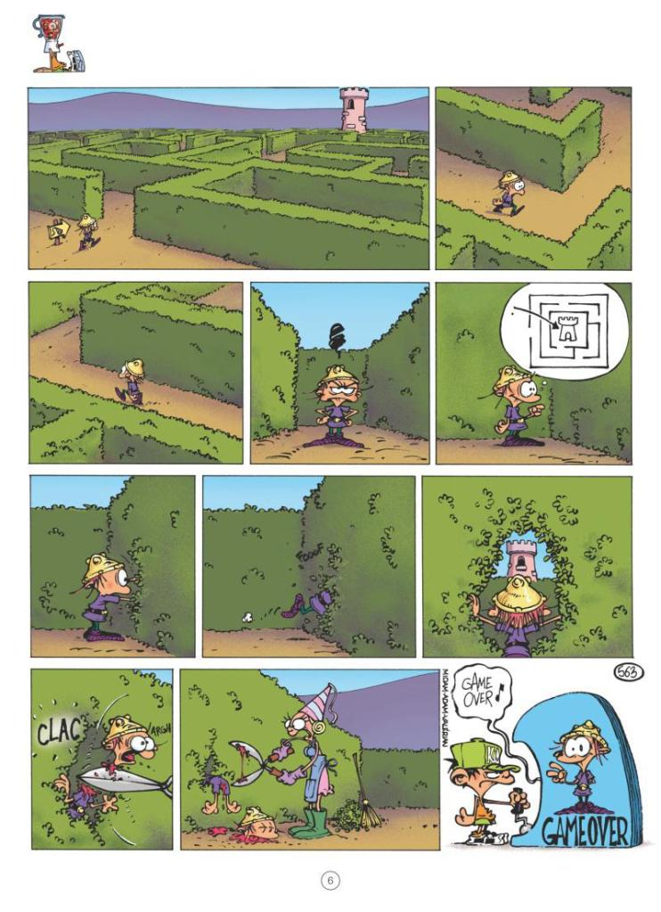 Et, dans le même esprit qu’un Skottie Young avec I Hate fairyland, Midam réinvente la mythologie de ses héros sans panne d’inspiration. Mieux, puisqu’il ne quitte jamais vraiment le pâté de maisons vu et revu dans lequel évoluent ses personnages (le home « gore home entre papa le poltron et Carole qui veut désormais être une grande sportive, le cinéma interdit aux gnomes, le palace des jeux vidéo et le décor de ceux-ci, et c’est à peu près tout… ah non, ils vont aussi au… Musée), Midam le réinvente.