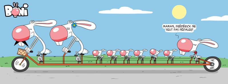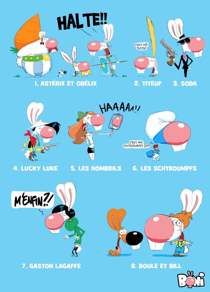 Beaucoup de Boni, vous vous en doutez. Il y a bien d’autres personnages, mais ils sont très éphémères. Alors, je me concentre sur le quatrième album de mon lapin. Si je sens une évolution depuis le premier gag, je ne sais pas. Peut-être dans l’humour ? Il faudrait voir.