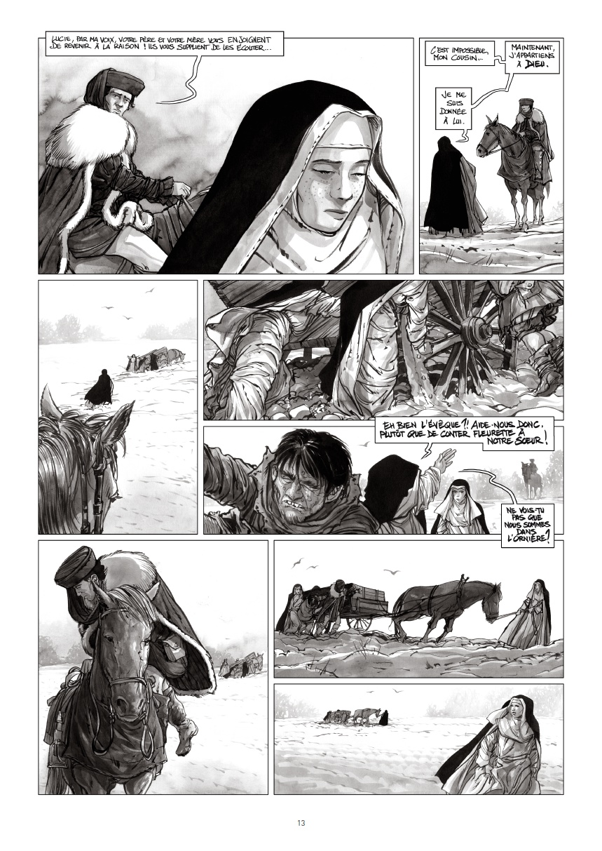 Résumé de l’éditeur : Champagne, février 1357. Henri, évêque de Troyes, chevauche vers le lazaret de Lirey, pour tenter de convaincre sa cousine Lucie, dont il est amoureux, de renoncer à ses vœux religieux. Dans la chapelle où ils sont réunis, les moines font cet amer constat : les caisses sont vides, et les travaux de l’abbatiale, qui doit accueillir un morceau de la Vraie Croix, seront bientôt arrêtés, faute de moyens… « Nous avons fait le serment de bâtir une abbatiale qui accueillera la relique, et nous serons fidèles à notre parole, quoi qu’il en coûte », s’exclame Thomas, le prieur de la communauté. Les ressorts de la tragédie, tant amoureuse que religieuse, sont désormais en mouvement…