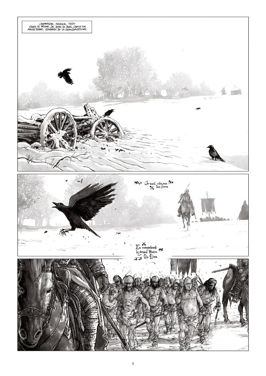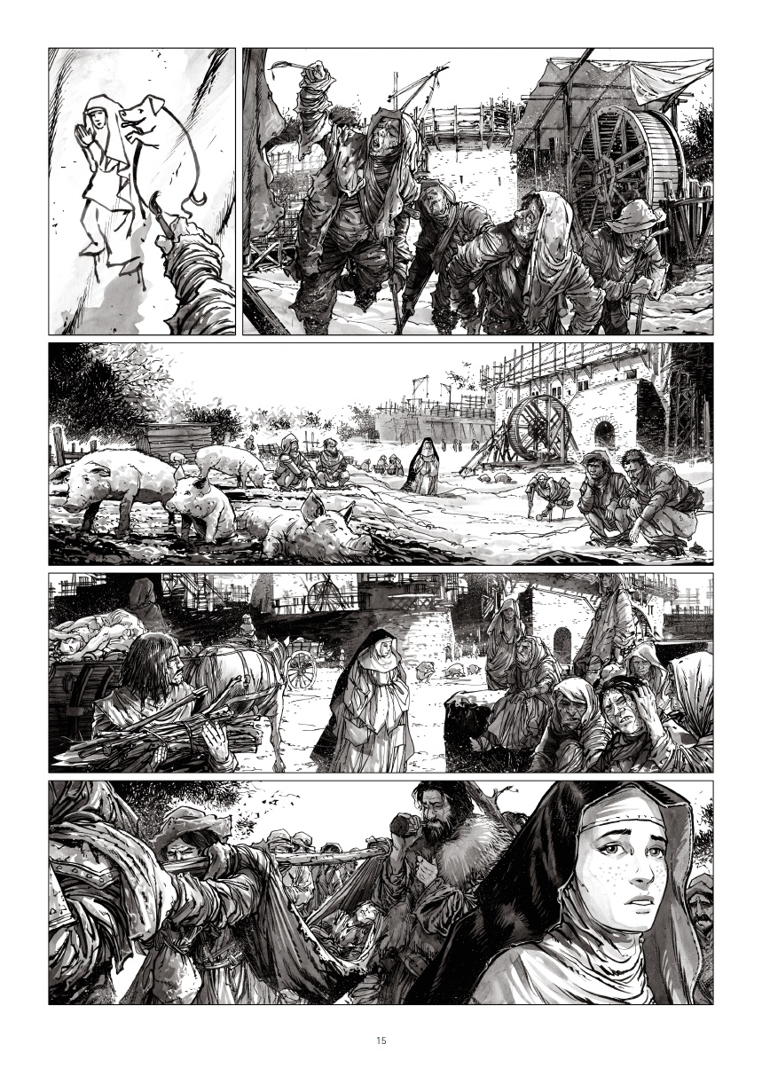 D’autant plus que la peste rampe, et ça n’arrange rien dans ce monde où il faut se méfier de tout, et de Dieu et ses suppôts, en premier. En émergent un commencement formidable, un capharnaüm moins divin que d’enfer et des planches qui se tournent emportée par l’énergie du désespoir de tous ces personnages marquants. Et dire que, sur la toile, le spectacle se fait à coup de centaines de milliers de dollars. Et dire qu’il ne suffit à Liberge que d’empoigner ses admirables crayons et lavis pour dégager une puissance colossale, historique sur une formidable matière.
