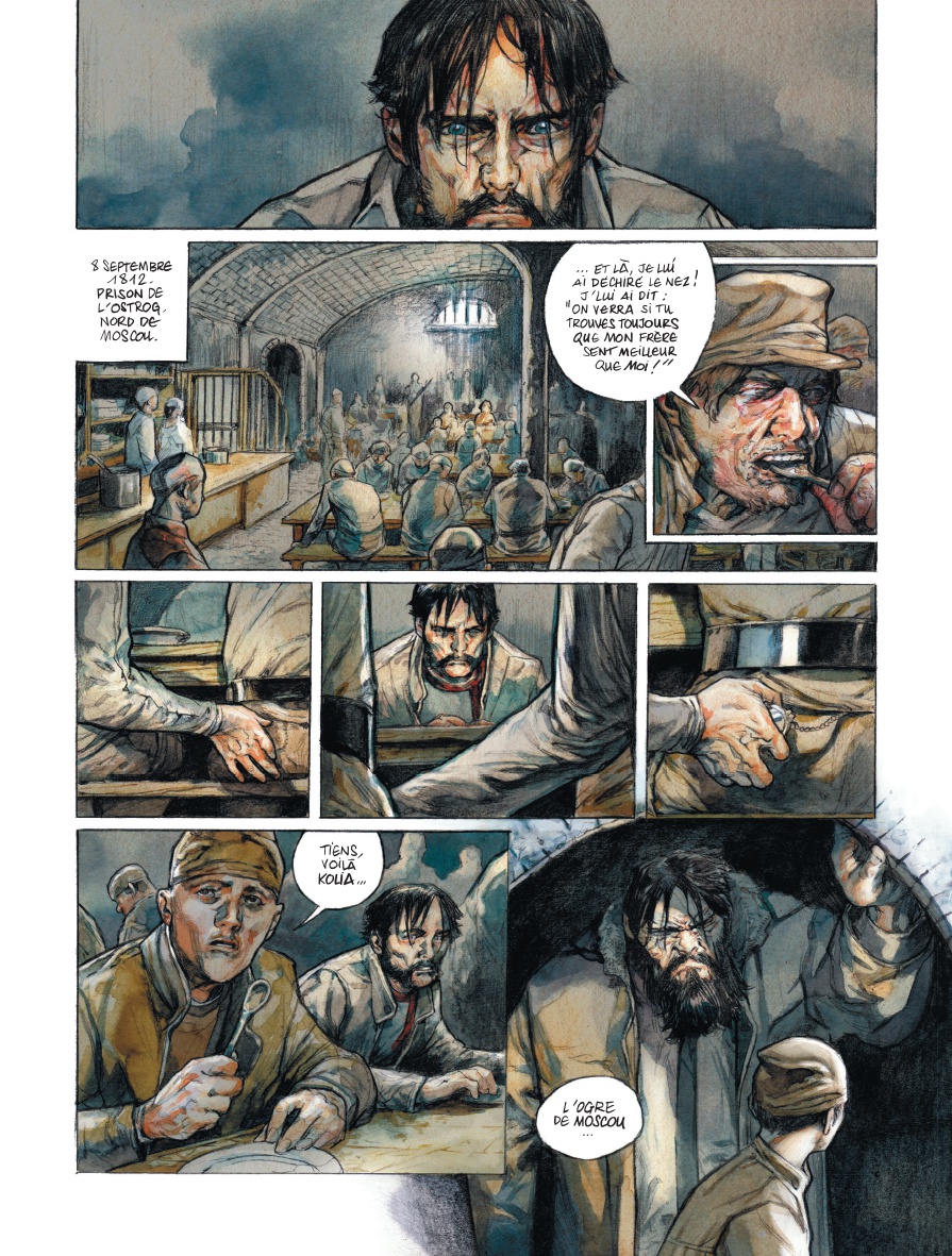 Y’a-t-il décor plus grandiose que celui d’une ville, une nouvelle Néropolis, qui vit ses dernières heures. Dans l’urgence, la folie, l’envie de survie et la loi de la mort, tout est possible. Et si c’est dans la brèche de l’Histoire, c’est encore mieux. Moscou, automne 1812, le cadre est idéal pour libérer le mal et ses apôtres. Le capitaine a quitté le navire mais pas les rats qui vont consolider leurs viles positions. Rostopchine vient de libérer les prisonniers, et ceux de la pire espèce avec, dans les rues d’une ville bientôt ardente. Mais, forcément, la prison ayant contenu trop longtemps leurs funestes aspirations, les bagnards vont faire bien plus, bien pire, que de jouer les pyromanes. Ils ne vont pas se priver de mettre la ville à sac, à feu… mais aussi à sang, dans des rivières, des coulées de laves écarlates. Comme la donne, les couleurs ont changé et c’est presque à l’aveugle que les deux auteurs nous guident dans cette ville qui n’a plus de repère. C’est malaisant.
