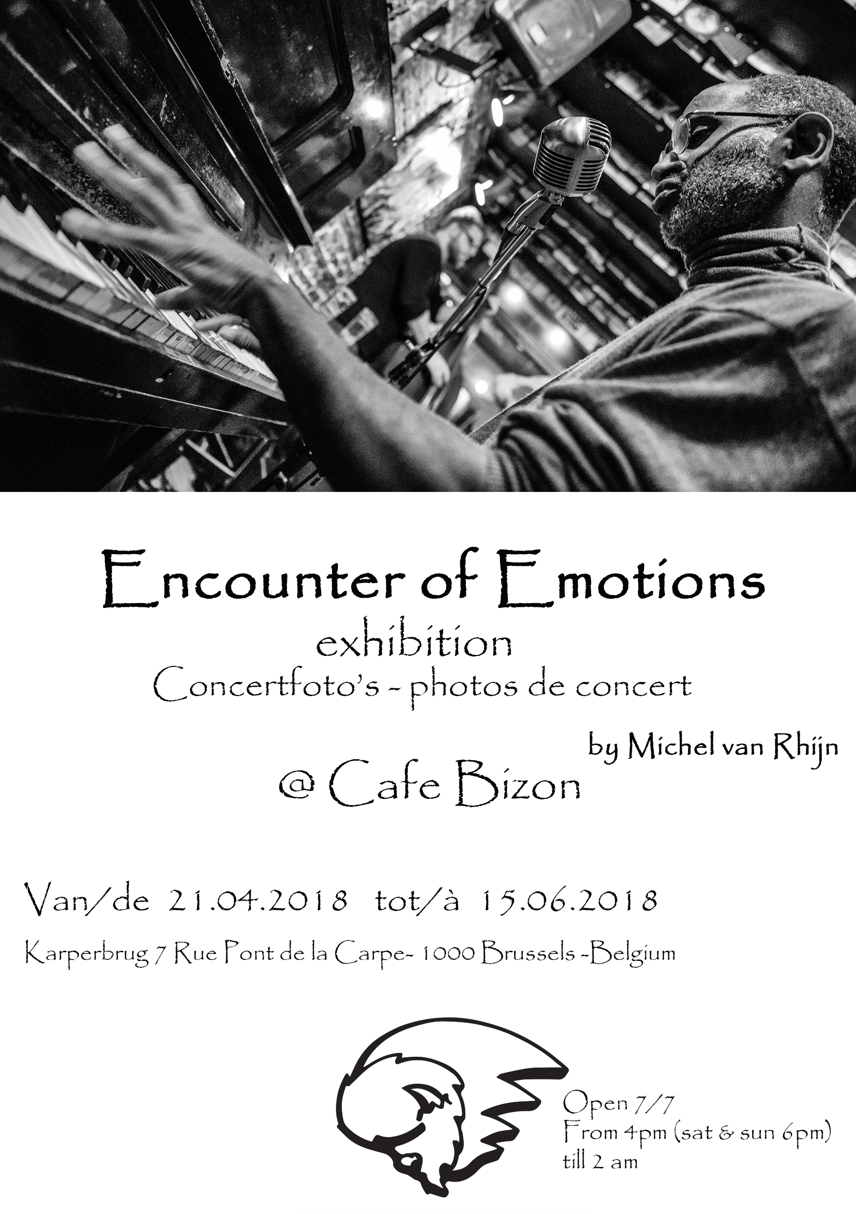 Michel van Rhijn, photographe de concerts que je connais bien personnellement, exposera certaines de ses photos de concerts au Café Bizon à Bruxelles entre le 21/04 et le 15/06 et y présentera aussi son livre. Le 21 avril aura lieu le vernissage auquel j’assisterai.