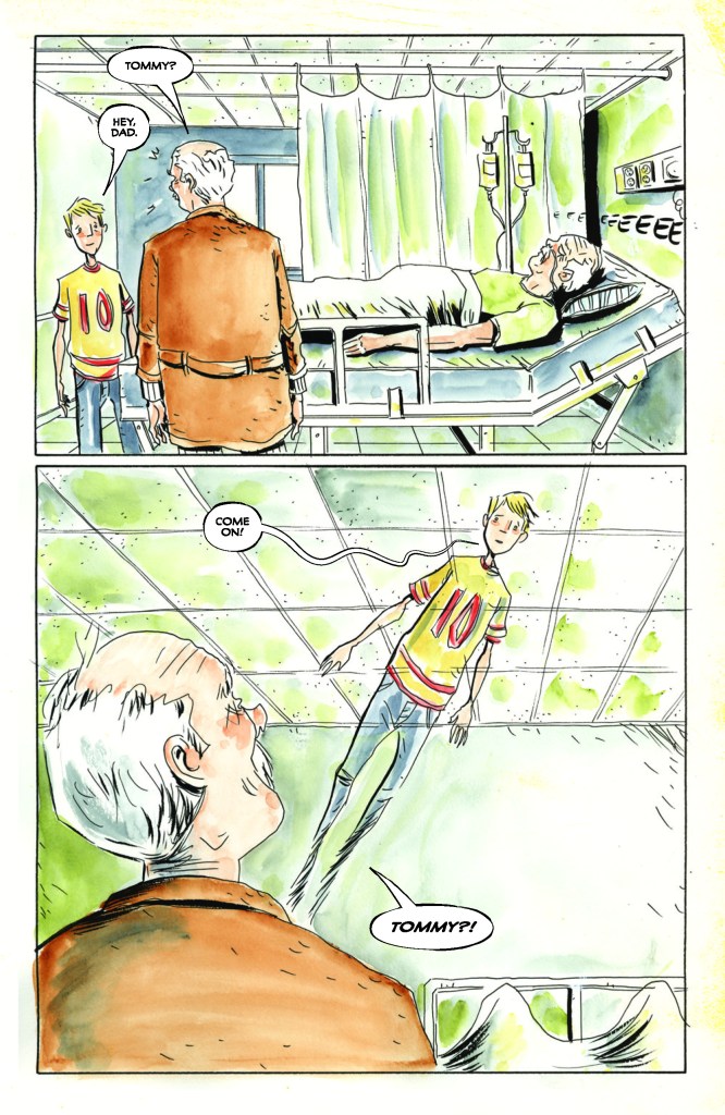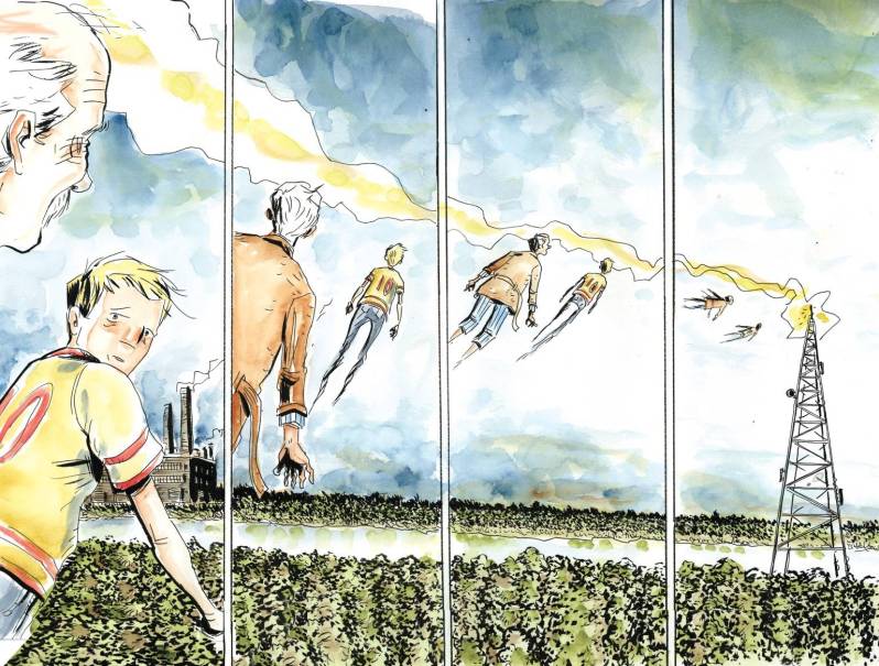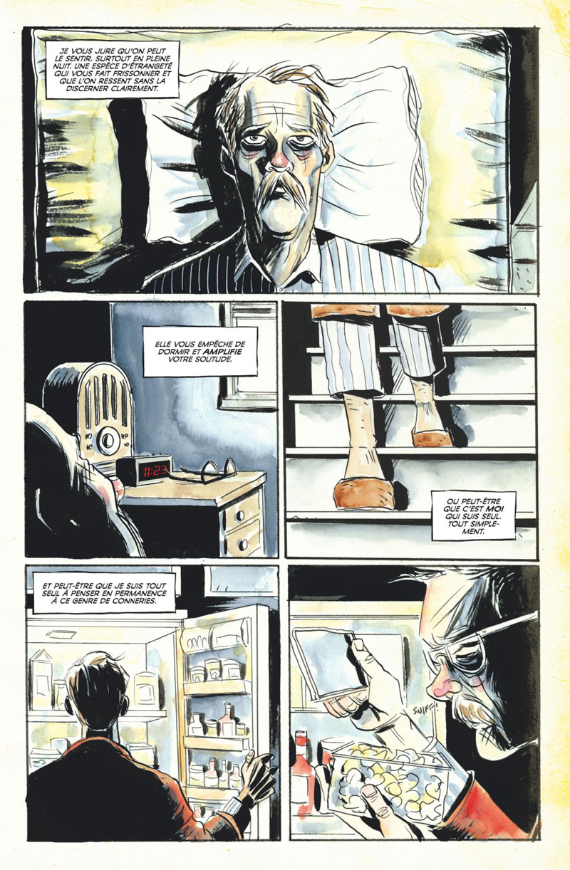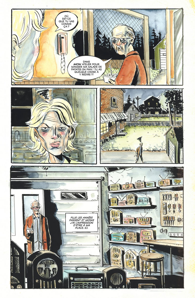 Sauf qu’en s’impliquant dans le versant psychologique de ses personnages, cette famille justement décomposée (on ne pouvait rêver mieux comme titre pour ce premier tome), Jeff Lemire va plus loin que beaucoup de choses imaginées jusqu’ici : il ne vit pas avec la mort mais avec la vie, au pays des vivants, il la grandit et l’allonge là où elle s’est arrêtée brusquement. Il y met des couleurs faussement naïves de l’enfance, y implique une grande imagination (un coup de fil mis sur orbite, notamment qui finit de conquérir) et les souvenirs sont pris à leurs propres jeux et libérés de leur écrin, de leur cage.