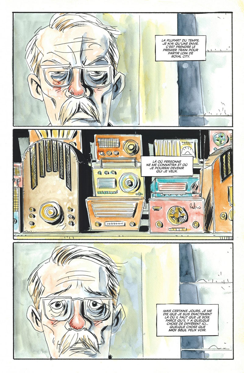 Jeff Lemire, ce n’est pas un crayon ou un feutre qu’il utilise pour coucher ses histoires, c’est l’encre de ses sentiments, un peu de son sang, un héritage de papier un peu plus conséquent à chaque album. Avec Royal City, l’afflux est imposant, auscultant le moment où tout bascule et les années, les lustres qui s’ensuivent toujours obnubilés par cet instant T, tétanisant. Une histoire de fantôme, donc. Comme il y en a déjà eu. Une ville en connexion avec ceux qu’elle abrite sans les protéger des maux du monde, aussi. On a déjà vu ça aussi.