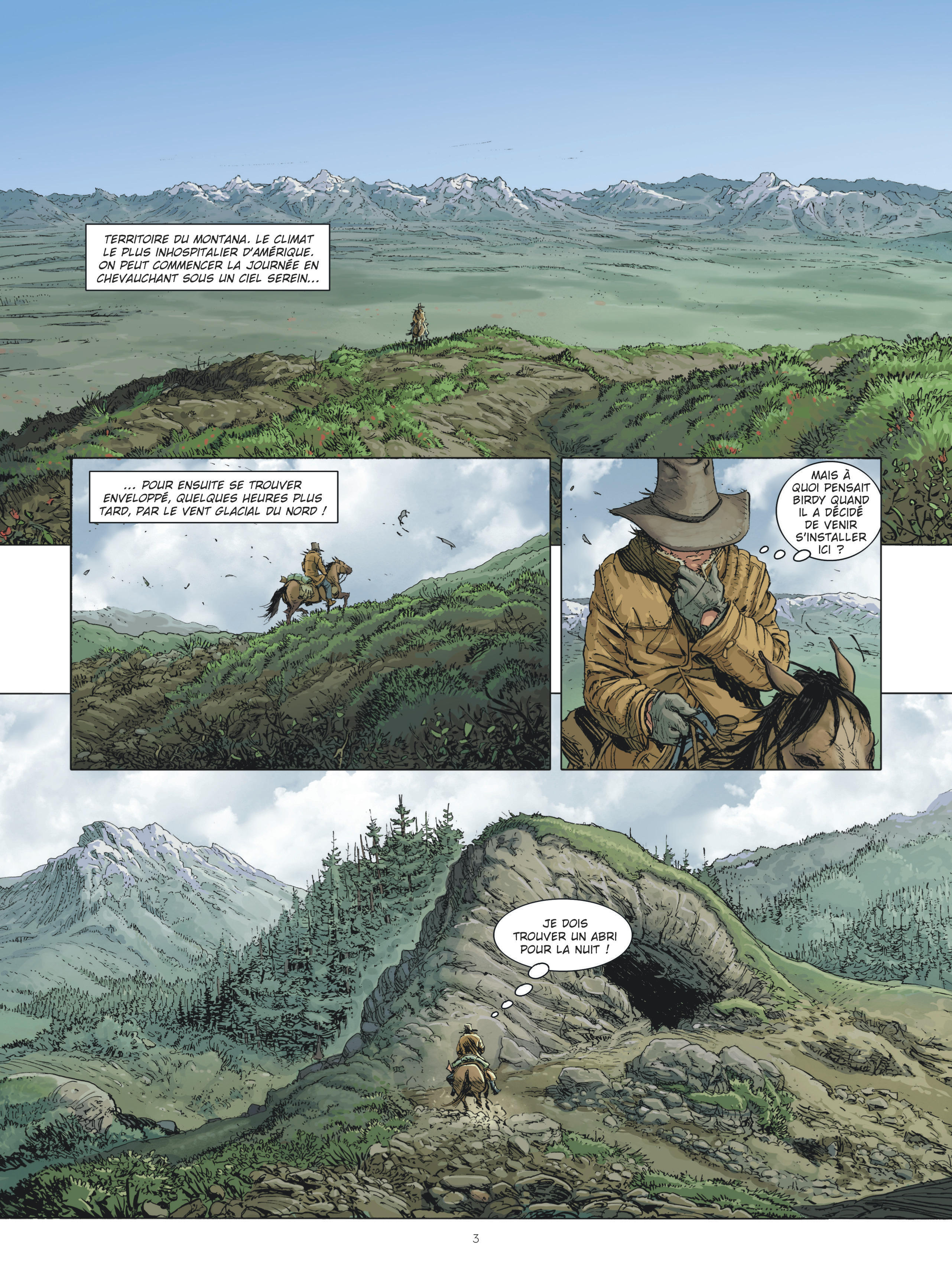 Pourtant, s’il est vrai que notre cowboy solitaire nous raconte d’emblée à quel point les temps sont inhospitaliers dans le Montana et qu’on sent le vent piquant, c’est les deux pieds et les quatre fers dans la verdure vallonnée que commence cette histoire. Sans quête si ce n’est celle de trouver un abri pour passer la nuit. C’est sans compter les mystères de l’ouest qui l’interpellent sous forme de signaux de fumée. Des Indiens qui tente de faire passer des messages ? Non, les Indiens sont morts ce soir, femmes, hommes et enfants, et le chef planté avec son propre tomahawk. L’affaire de bandits sans scrupules que Tex ne va pas laisser passer. Et la piste, de boues en torrents secoués, va mener à Théodore Tirrell, représentant armé jusqu’aux dents de la Fur Company, spécialisée dans le trafic de fourrures, mais à son ami perdu de vue : Birdy.