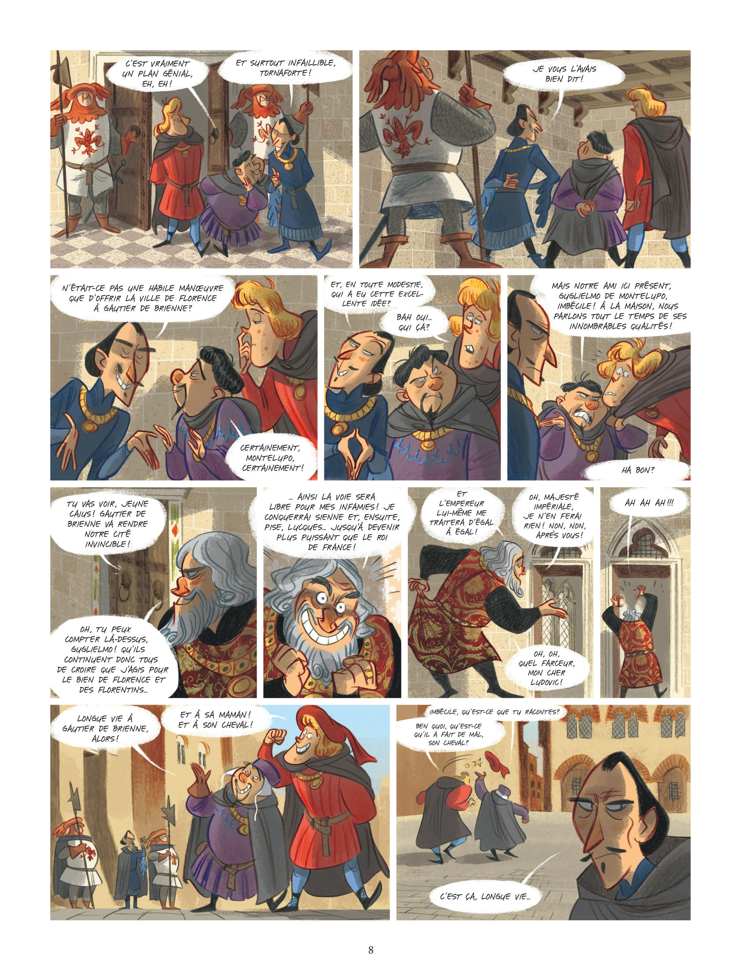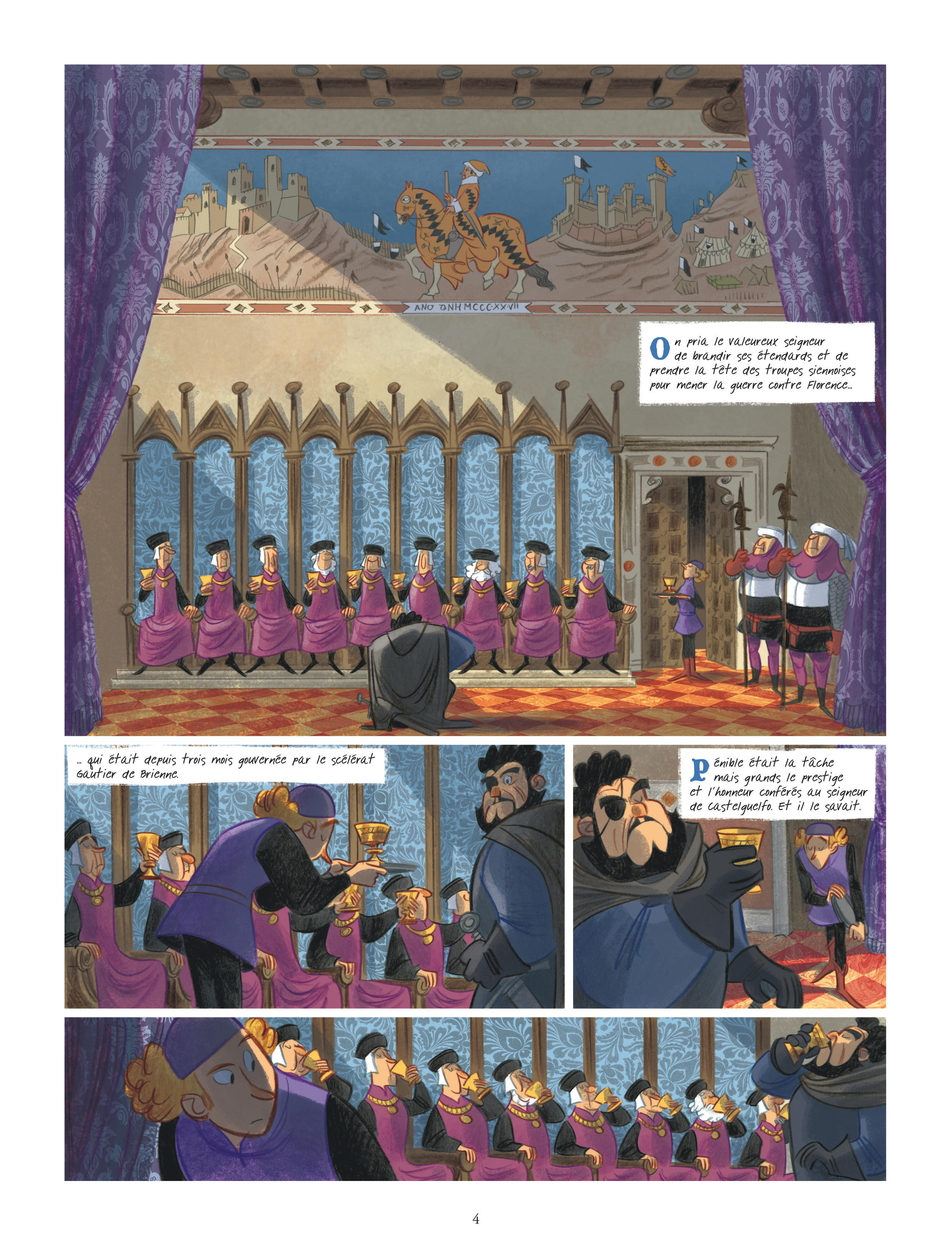 Résumé de l’éditeur : Alors que le seigneur de Castelguelfo se prépare hardiment à la guerre contre l’infâme Gautier de Brienne, sa fille, Lucilla, fuit le château familial pour explorer le monde en compagnie de ses amis Tosca et Rinaldo. Les merveilles qui’ils croisent sur leur chemin sont innombrables mais en ces temps de guerr, le danger guette…