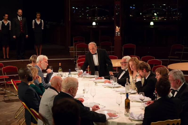 Chaque soir, une partie du public fait partie intégrante du banquet et dîne, avant que la pièce ne commence, en totale immersion dans l’espace où évolueront les comédiens lorsqu’ils prendront place autour de la table centrale. Une excellente idée qui met le spectateur dans l’ambiance dès son arrivée sur les lieux. Épatante idée de mise en scène aussi que d’intégrer l’architecture du chapiteau à la pièce, transformant la scène de celui-ci en chambre ou en bureau par la magie de projections en noir et blanc recréant partiellement un décor, et d’ajouter quelques gros plans au jeu des comédiens lors de certaines scènes clefs de la pièce par le biais d’une caméra mobile portée à l’épaule par un vidéaste.