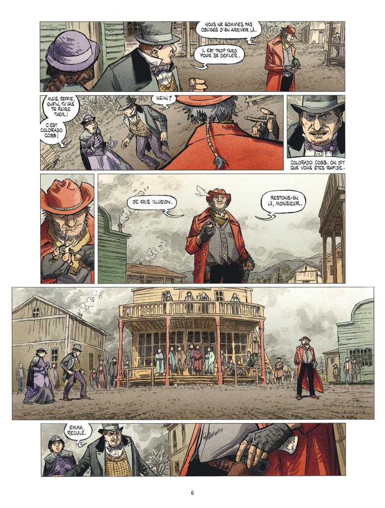 Même s’il y a toujours de la place pour les impostures. Ainsi Colorado Cobb vient d’arriver en ville, sa réputation le précède, surtout celle que les livres lui prêtent (on retrouve un thème de Sykes) mais le gaillard semble en fait bien moins net et traîne quelques ennuis qui vont bientôt mettre la ville à feu et à sang.