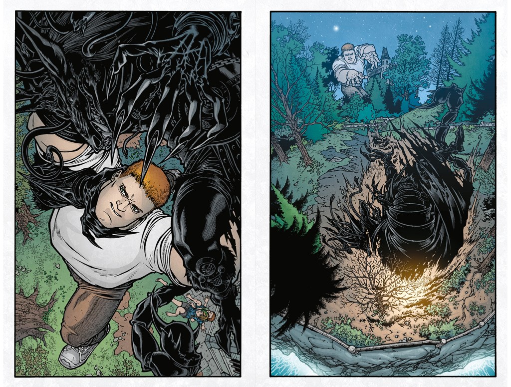 Préfigurant et transfigurant une Amérique malade et schizophrénique, Locke and Key signe la rencontre entre Gabriel Rodriguez et Joe Hill (le fils d’un certain Stephen King, ceci expliquera cela) autour d’une famille un peu plus dysfonctionnelle depuis la mort du patriarche, Rendell, dans des circonstances atroces, lors d’une journée terrible qui a impliqué toute la famille au coeur de l’horreur perpétrée par deux gamins déphasés. À la Shining en inversé. Car le cauchemar commence dans les premières planches sans sommation, découpé à la hache entre présent chaotique et passé chahuté.