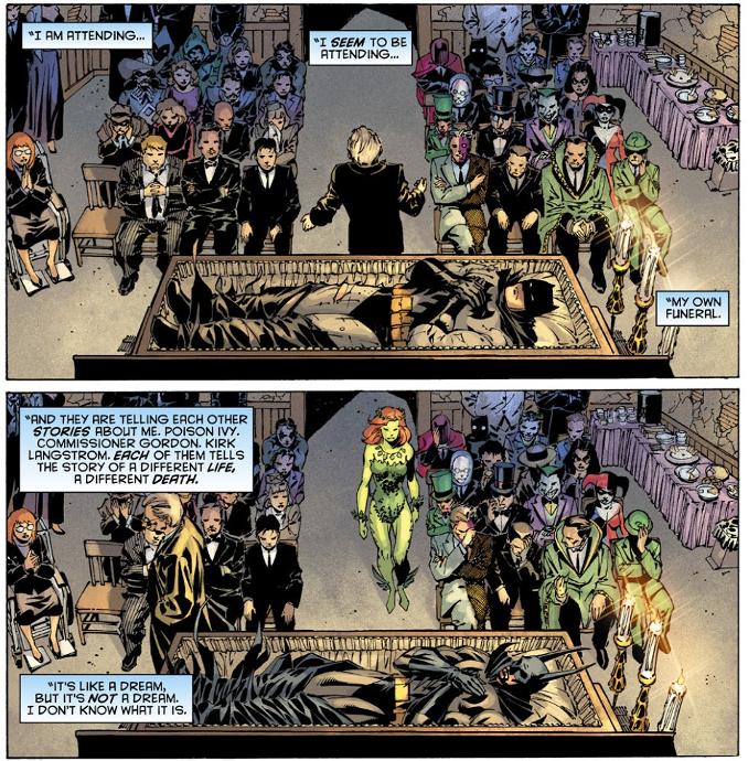Résumé de l’éditeur : Batman est mort. Et pour sa veillée funèbre, amis comme ennemis sont invités. En sa mémoire, tous se prêtent au jeu et se remémorent l’immense Chevalier Noir. Mais Batman est-il vraiment mort ?