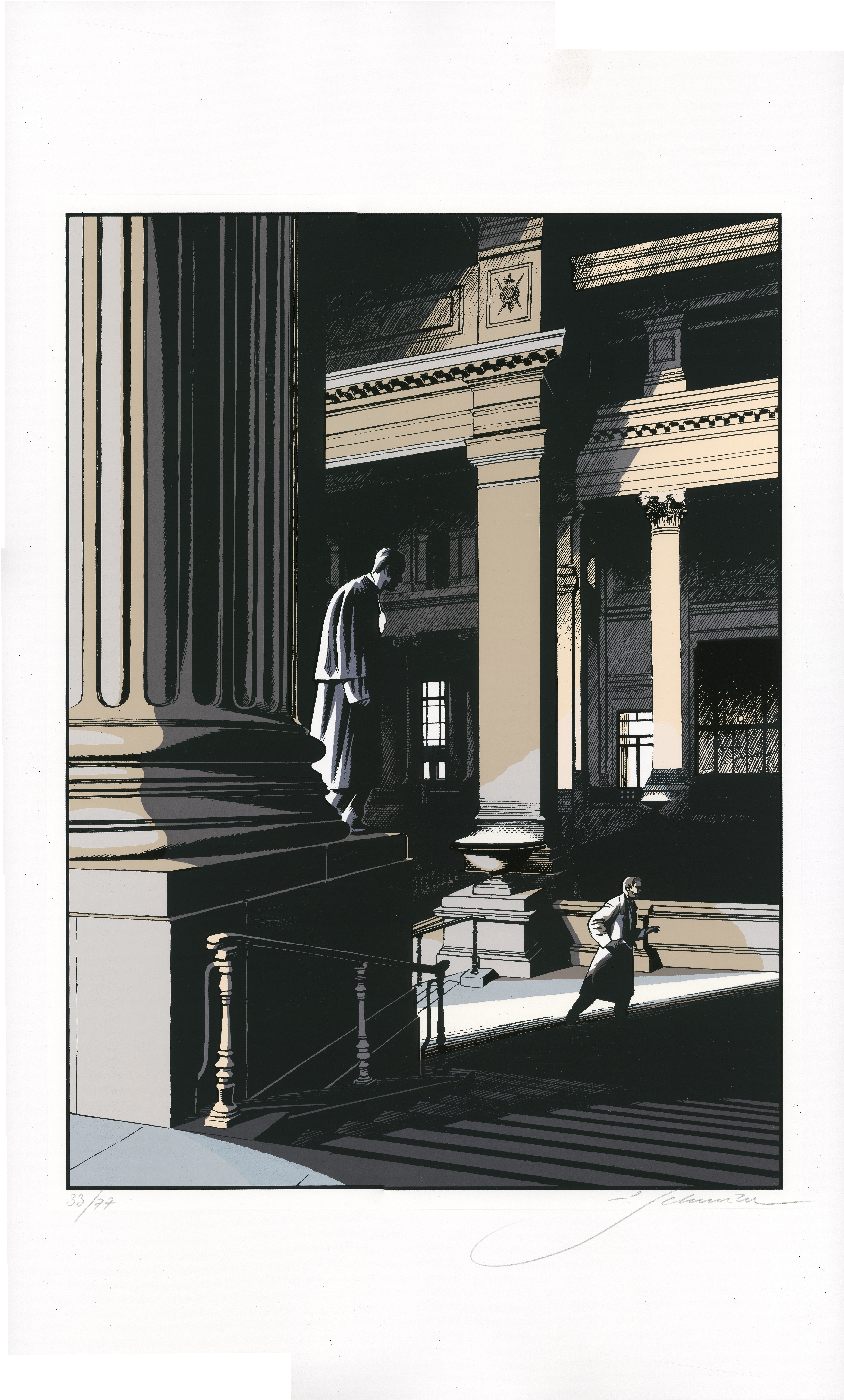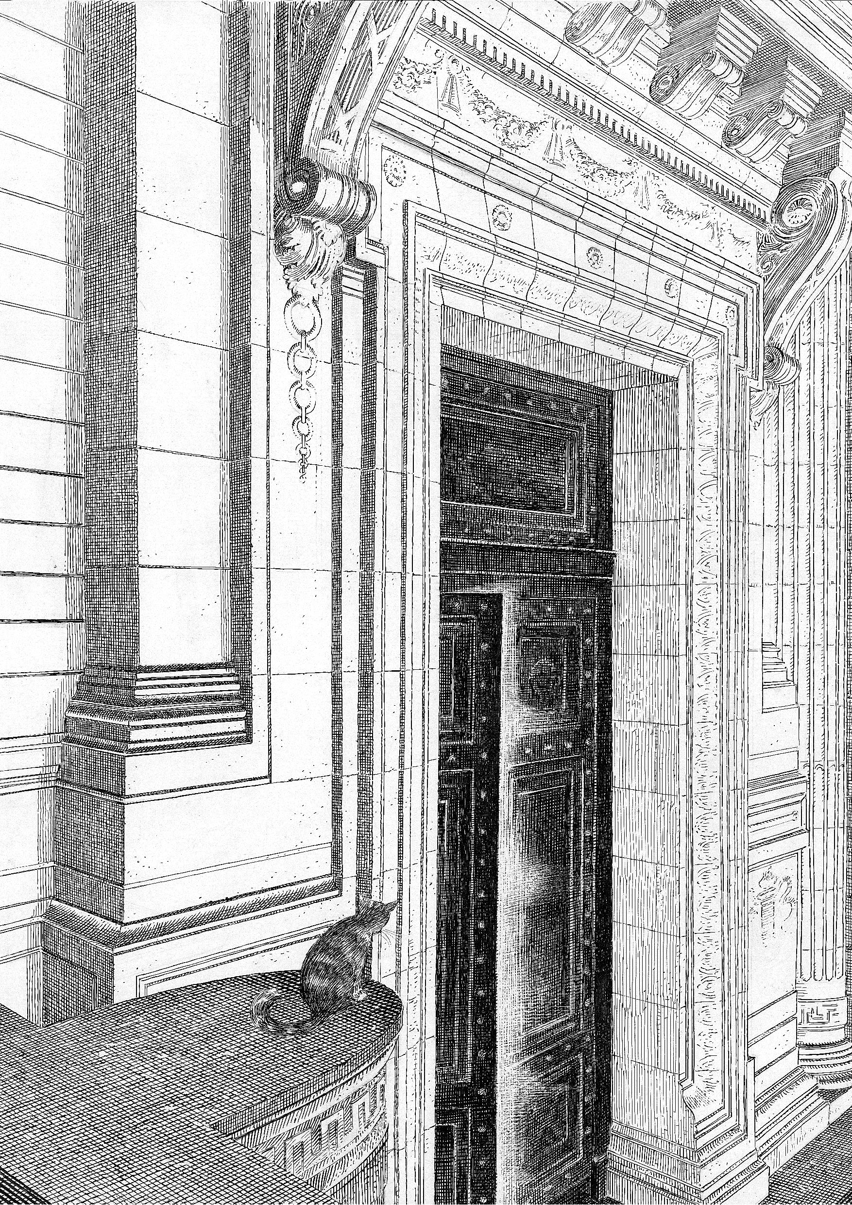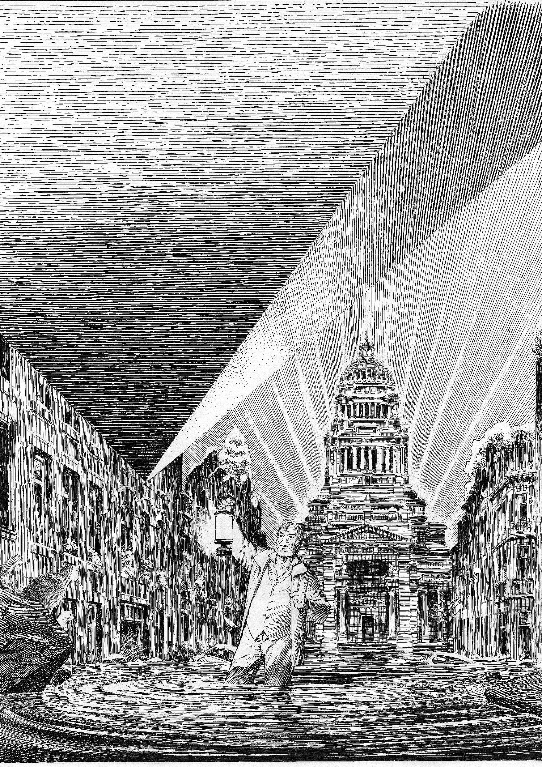 François : Et quand on dessine, on se rend compte que ce n’est pas si facile à rendre sur papier. Ou alors on met des pierres les unes à côté des autres et on ne dessine… rien. Il faut donc trouver et réfléchir l’angle pour restituer l’échelle. C’est un problème d’échelle. Mais le palais de justice aussi fut compliqué. Car, plus on s’en rapproche, plus la coupole disparaît. Les éléments devant cache. Et en s’éloignant, la silhouette est très différente. Très élevé de loin, il se racrapote dès qu’on s’en approche.
