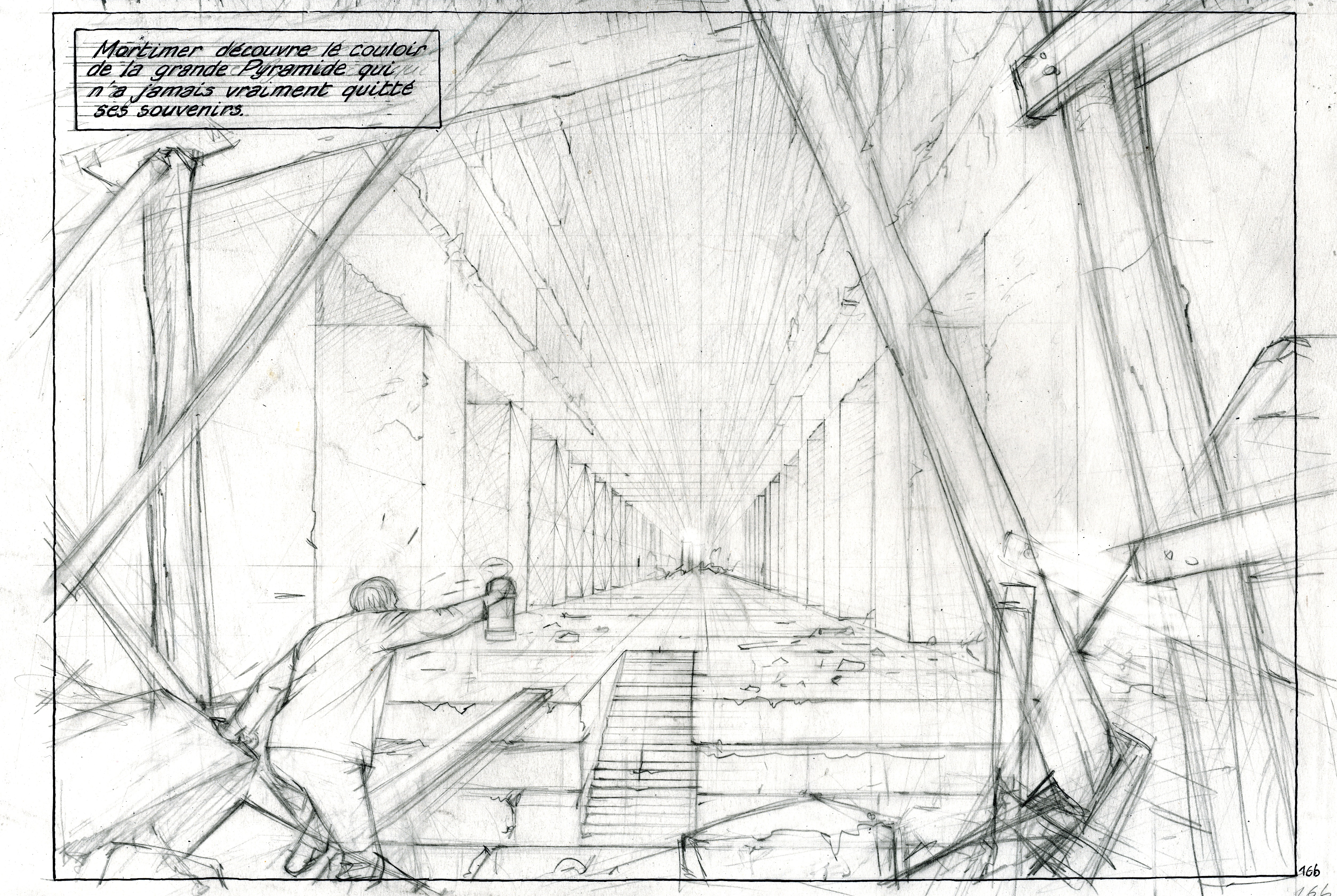 François : Jamais E.P. Jacobs n’est allé sur le plateau de Gizeh pourtant il a eu l’incroyable prémonition qu’il restait quelque chose à découvrir dans les pyramides. Il en était obstiné alors que les égyptologues serinaient que tout avait été mis à jour. Il voyait plutôt ces salles secrètes dans les fondations. Moi, j’y suis parti avec le projet Scanpyramid. Nous, nous étions plus haut. J’ai fait plein de dessin, Alexandre Obolensky aussi. C’était un homme extraordinaire, qui a disparu depuis.