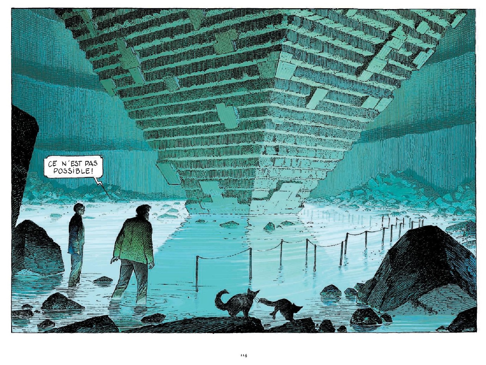 François savait ce que je ferais de son trait. Là, j’ai pris son trait en négatif. C’était gai d’emmener son trait ailleurs. Quand il a vu ça, il m’a dit que c’était super mais qu’il ne pensait pas avoir fait un truc pareil. En effet, c’était le négatif. J’attends la version noir et blanc, pour voir la différence. J’ai utilisé la phosphorescence, de la transparence. Là où François avait fait des piliers en roche, pour amener de la lumière, je les ai remplacés en cristaux. Il y a du Moebius. Déjà, rien qu’une pyramide à l’envers.