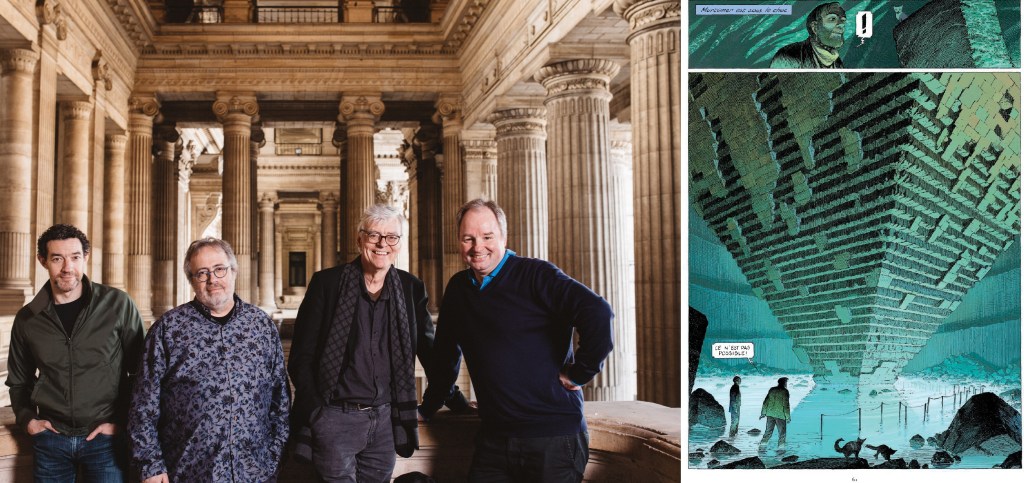 Ce fut l’événement de ce printemps et même de cet été BD, Blake et Mortimer se sont offert les regards incroyables et méticuleux de quatre artistes belges fondamentaux pour un hors-série miraculeux, bruxellois autant qu’égyptien : Le dernier pharaon. Un ouvrage phare… à eux : François Schuiten, Thomas Gunzig, Jaco Van Dormael et Laurent Durieux. Un véritable choc, graphique et contemplatif, entraîné dans les affres du temps, d’hier, d’aujourd’hui et de demain. J’étais présent lors de la conférence de presse du 28 mai, en grande pompe, à travers Bruxelles (de l’hôtel de ville au palais de justice puis à la Maison Autrique, dans un tram customisé). L’occasion de mener, à plusieurs moments, une grosse interview. Une interview-somme que j’ai essayé de reconstituer au mieux. J’ai pris une faille temporel depuis et la voilà enfin. Bonne longue lecture en compagnie de ces quatre ténors, renforcés par l’esprit de Jacobs.