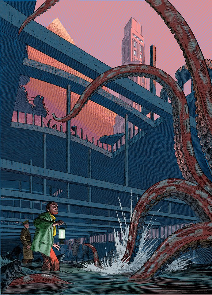 Laurent : J’ai procédé chronologiquement, j’aime savoir ce que ça raconte. Ce n’est pas du tout celle que j’utilise dans mes affiches. J’ai voulu mettre du vert, une couleur très peu utilisée, proscrite. Je ne sais pas expliquer pourquoi j’ai été la rechercher. Comme le violet, le mauve, le vert est oppressant, malade. Je la trouve anxiogène cette couleur, regardez Matrix. Elle fait qu’on n’est pas bien. Pour moi, le rayon devait incontestablement être vert. Le récit me guidait vers ce que je devais faire. J’avais lu l’histoire, je devais y mettre l’ambiance, on m’a dit de faire mon truc. C’était très délicat, il ne fallait pas que ce soit frontal, que le palais soit vivant et vibrant.