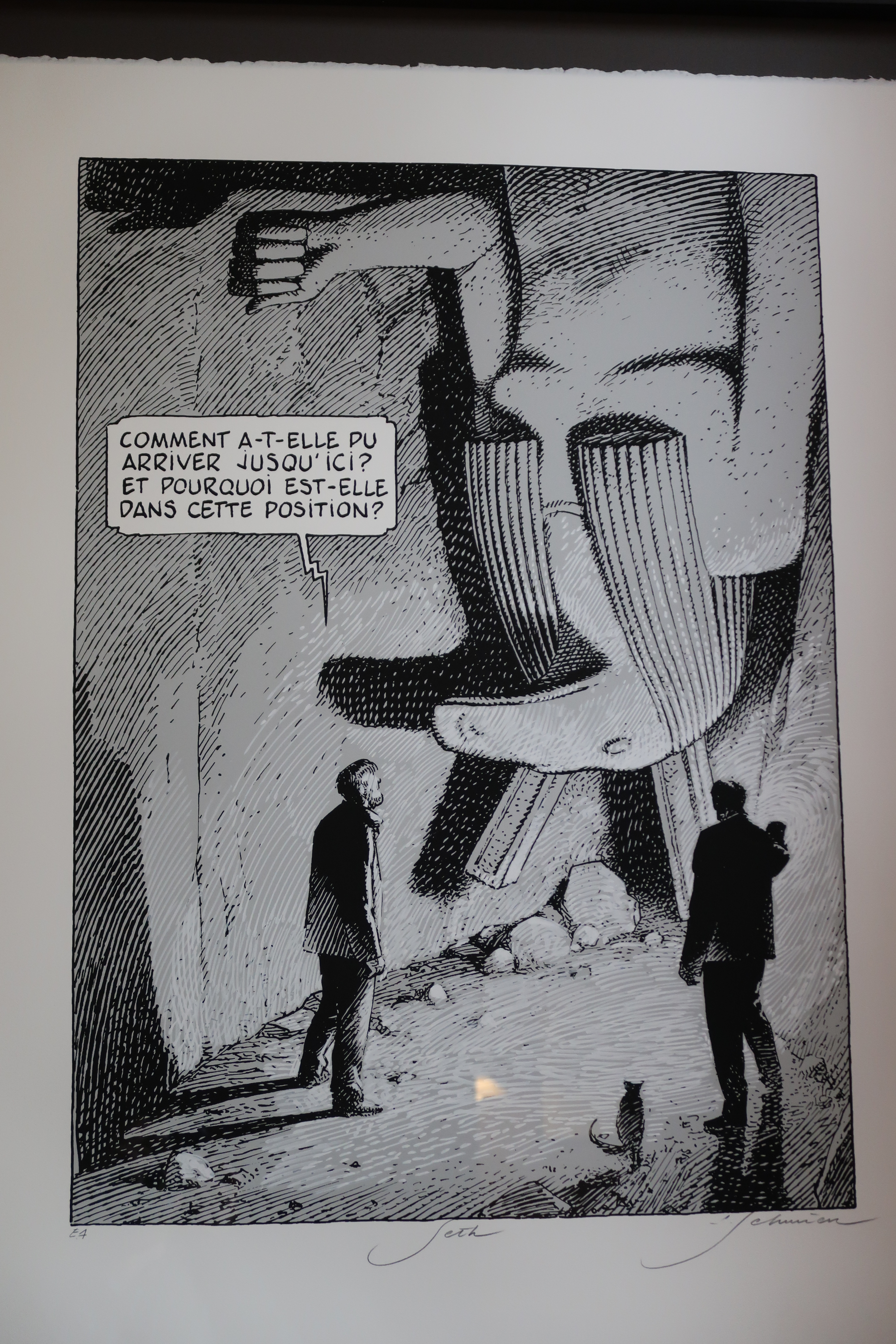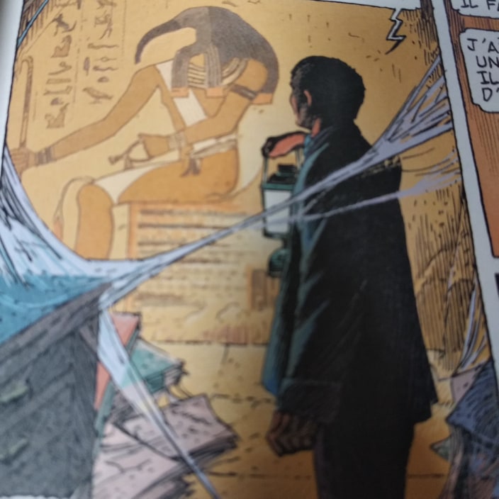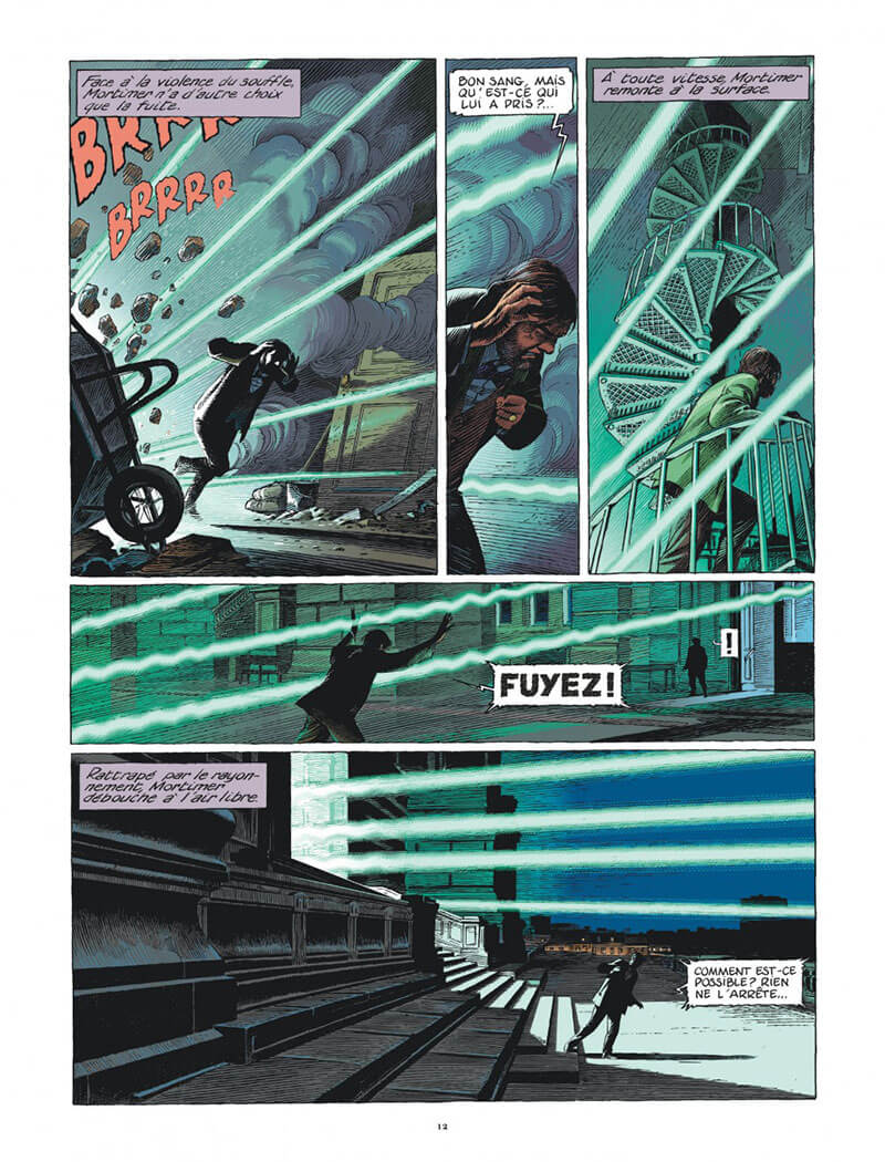 Laurent : Oui, une version bibliophile prévue pour plus tard. Puis il y a ce format à l’italienne, demi-planche après demi-planche. C’est la même chose, avec parfois plus de respect du suspense de fin de de planche. Pour une planche, nous avons dû revoir la narration. Quand Mortimer découvre la pyramide à l’envers. L’image prenait plus des 3/4 de la planche, nous avons donc du la couper en rajoutant un avant-plan de Mortimer, surpris. Et amener la réponse en tournant la planche avec le « C’est impossible ». C’est la version ultime qui met en valeur son travail, le mien et l’histoire. De manière très cinématographique.