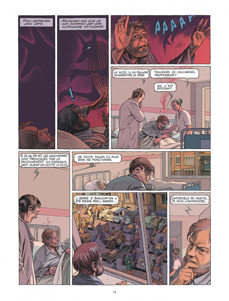 Jaco : Le lieu. Ce qui a convaincu François, c’est le palais de justice. Et comme il y a des traces étranges de sphinx et d’autres symboles égyptiens. Puis, ce qu’il y a super dans cet album, c’est que le lecteur sait des choses que les héros ne savent pas. On peut toujours compter sur ce phénomène. Et Mortimer continue à cauchemarder.