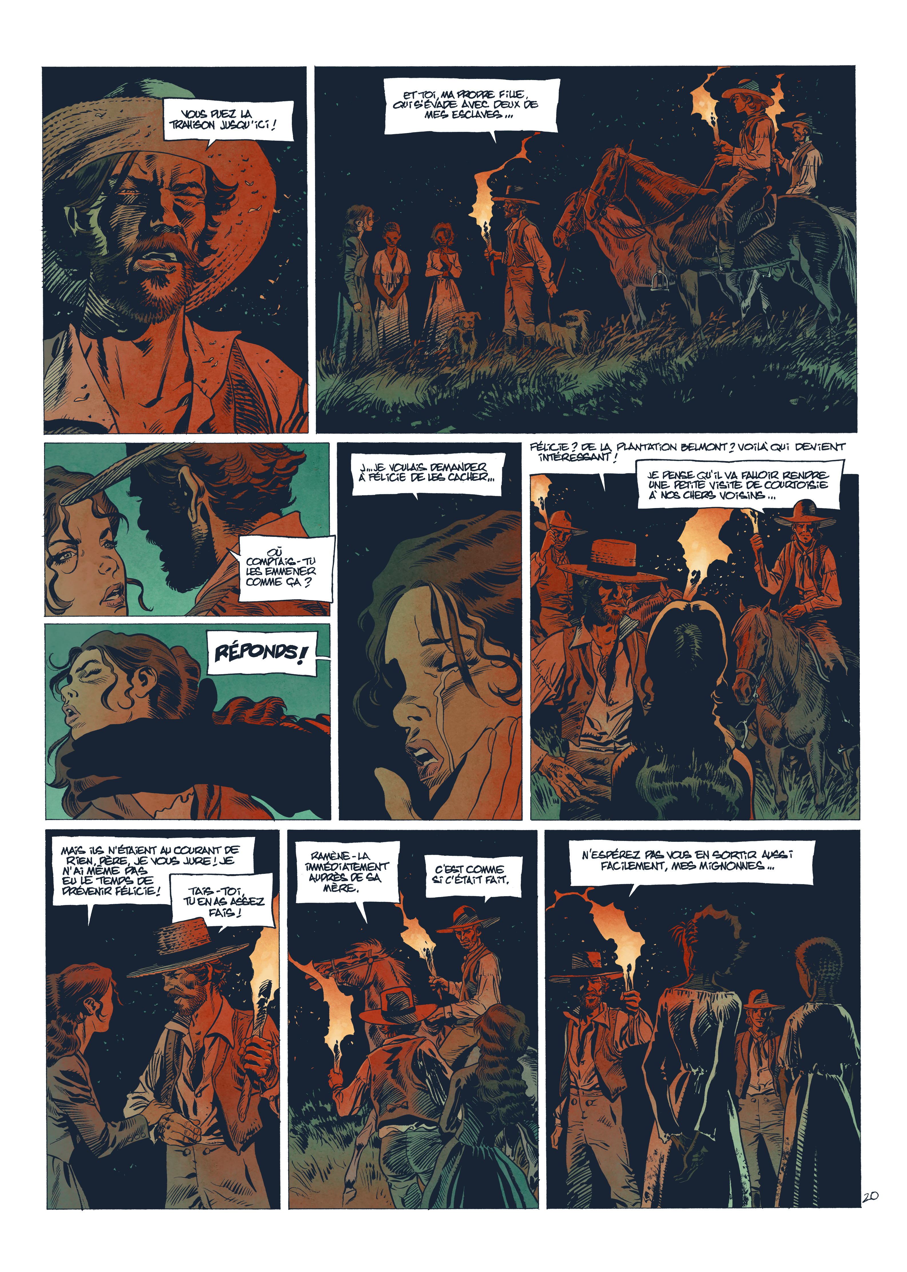 Gontran: Oui, ça part de là. J’aime représenter tout ça. Mais, ici, c’est totalement différent de mes deux premiers albums. Je préfère dessiner des décors naturels à des bâtiments. Le seul problème, c’est que nous n’avons pas grand-chose comme documents photographiques. Il faut se rabattre sur les séries, les films. Puis, il faut aussi se dire que cet album n’est pas fait pour apprendre les rouages d’une plantation de l’époque. Il faut donner matière à y croire tout en ne s’écartant pas de ce qui est porteur : les rapports humains.