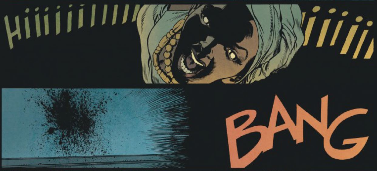 Cette case, elle est inspirée d’American Beauty. Une balle est tirée mais au moment où elle va atteindre son but, la personne mise en joue, la caméra dévie d’un coup sec.