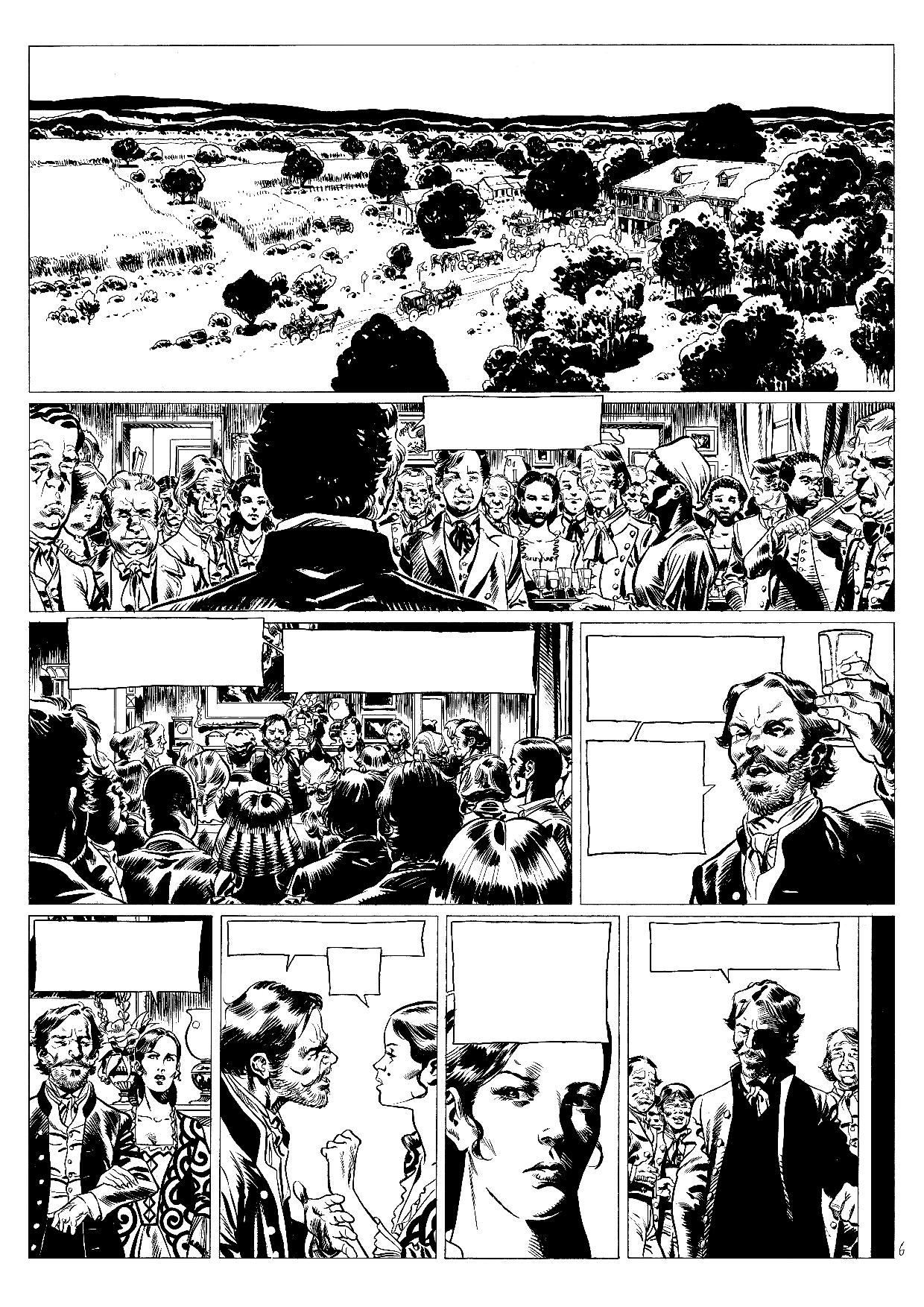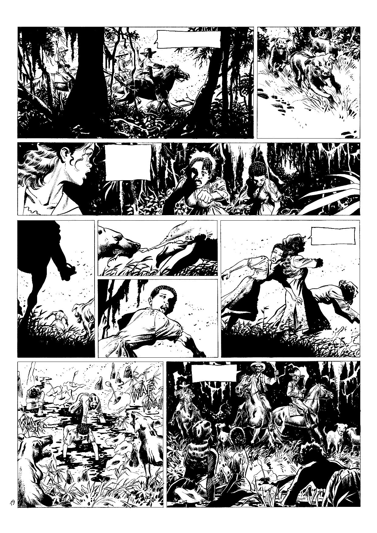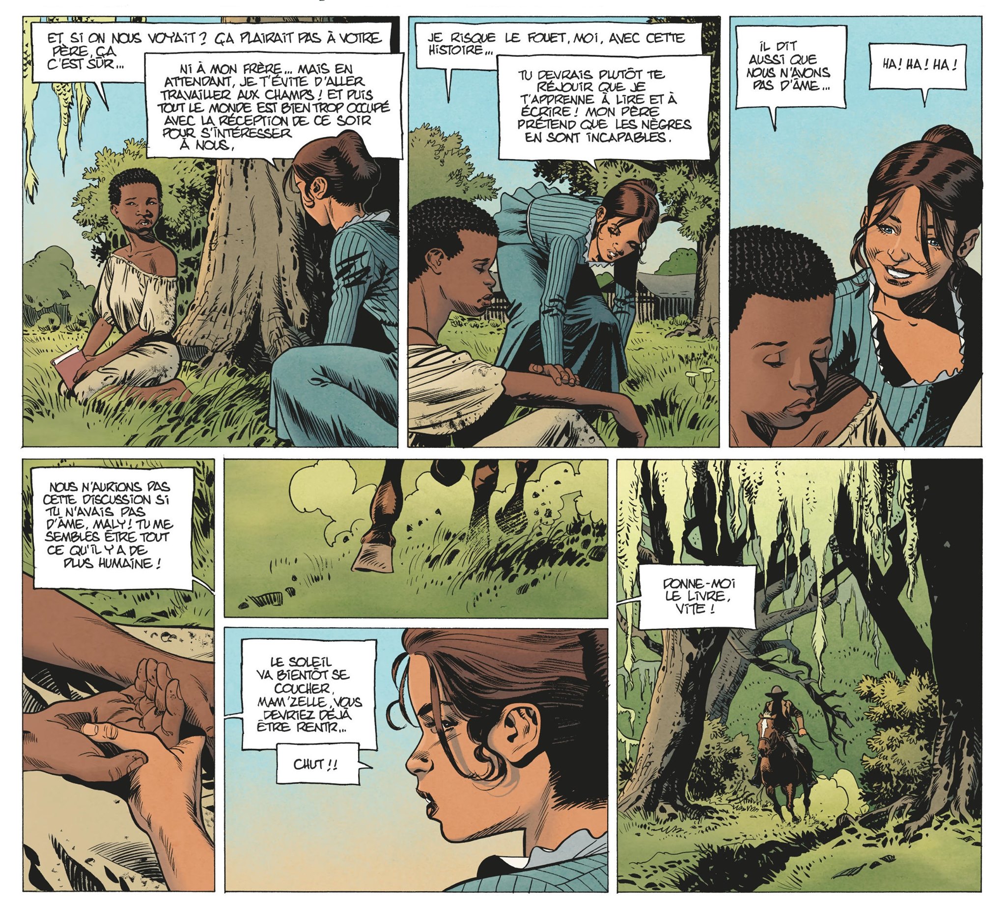 Gontran: Oui, ça part de là. J’aime représenter tout ça. Mais, ici, c’est totalement différent de mes deux premiers albums. Je préfère dessiner des décors naturels à des bâtiments. Le seul problème, c’est que nous n’avons pas grand-chose comme documents photographiques. Il faut se rabattre sur les séries, les films. Puis, il faut aussi se dire que cet album n’est pas fait pour apprendre les rouages d’une plantation de l’époque. Il faut donner matière à y croire tout en ne s’écartant pas de ce qui est porteur : les rapports humains.