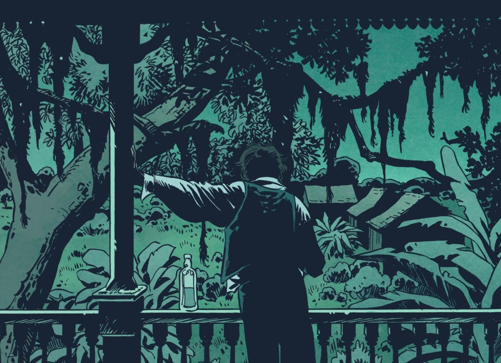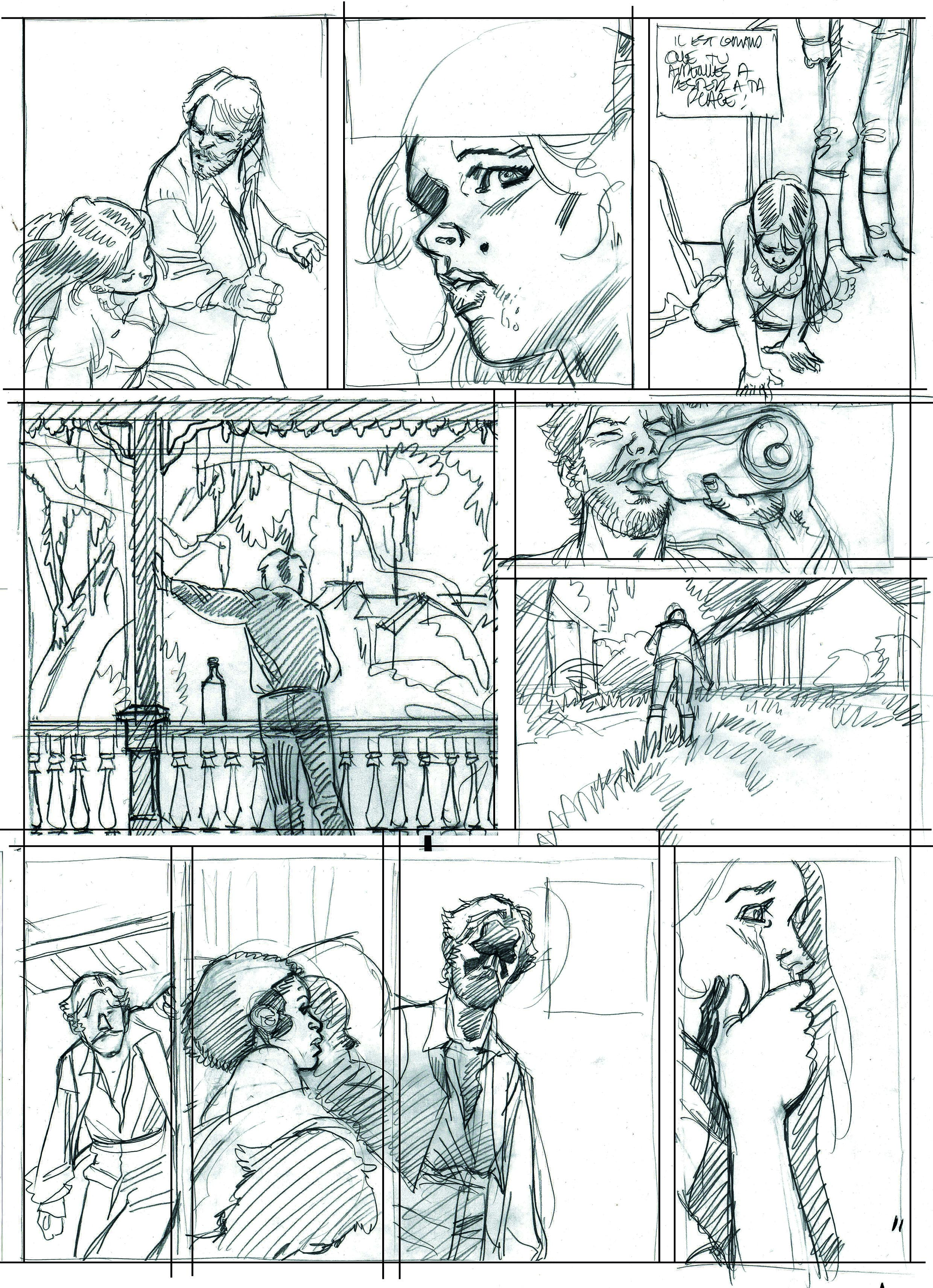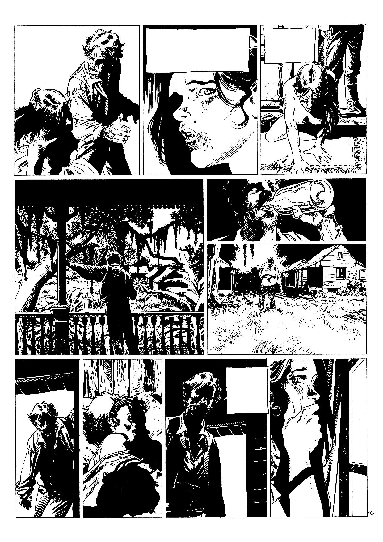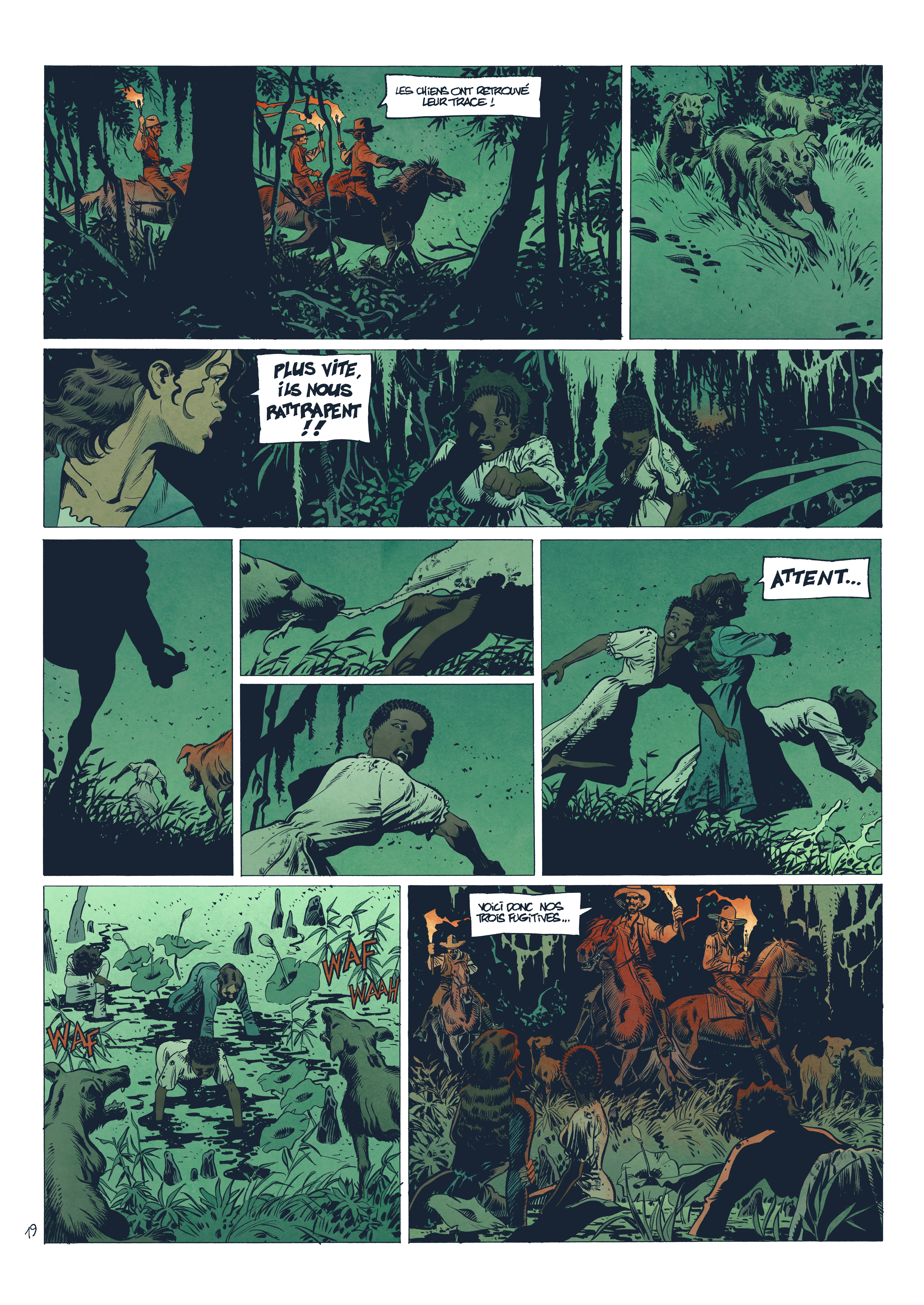 Gontran: Oui, ça part de là. J’aime représenter tout ça. Mais, ici, c’est totalement différent de mes deux premiers albums. Je préfère dessiner des décors naturels à des bâtiments. Le seul problème, c’est que nous n’avons pas grand-chose comme documents photographiques. Il faut se rabattre sur les séries, les films. Puis, il faut aussi se dire que cet album n’est pas fait pour apprendre les rouages d’une plantation de l’époque. Il faut donner matière à y croire tout en ne s’écartant pas de ce qui est porteur : les rapports humains.