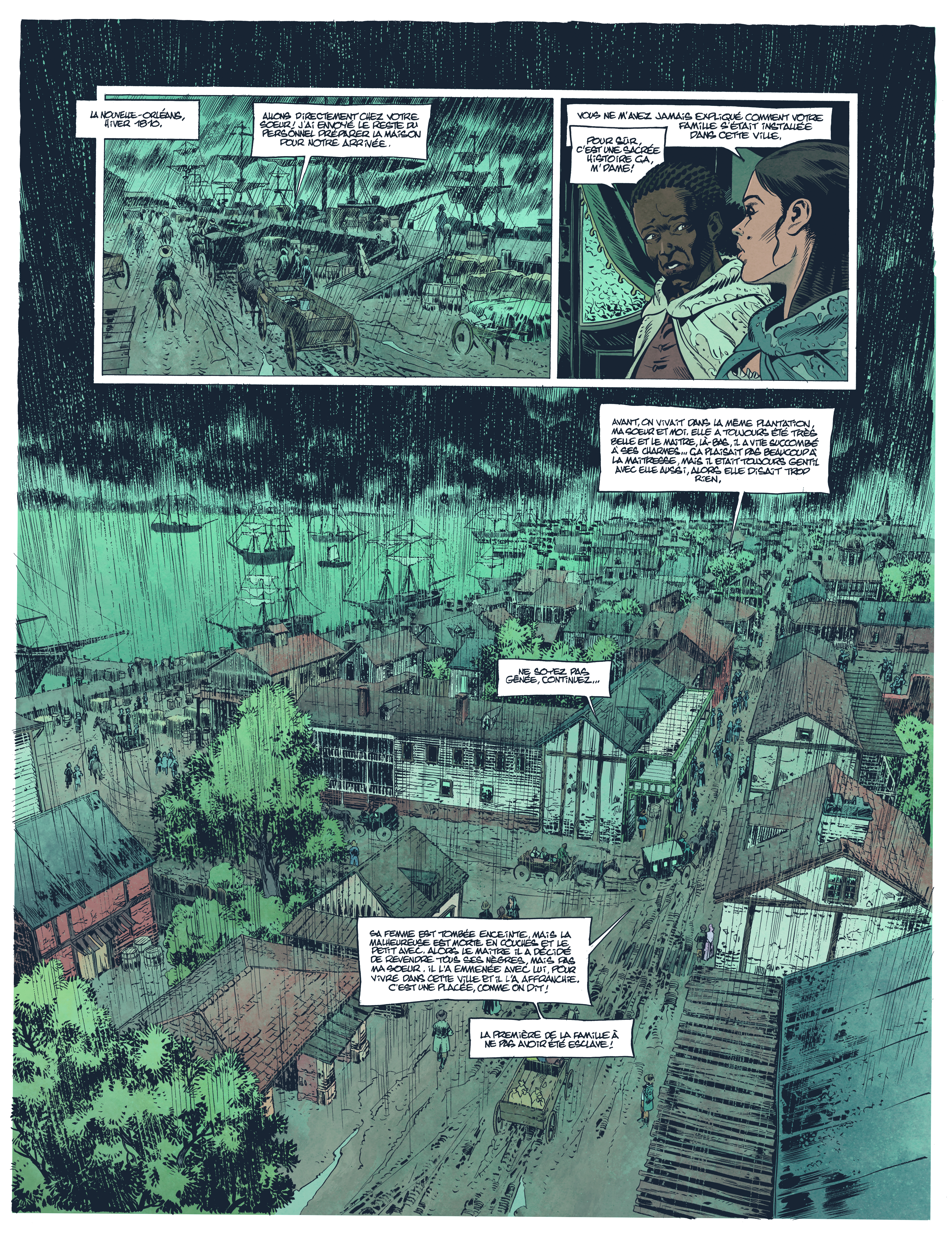 Gontran : Exact, ça permet de dynamiser, de dramatiser aussi. Dans ce premier tome, nous varions entre humidité et chaleur. À l’époque de notre voyage, nous avions pris des photos sans savoir qu’elles allaient nous servir. Le bayou, le Mississippi. Après, la ville en tant que telle, Nola, a beaucoup changé. Nous ne pouvions pas nous baser sur nos photos. D’ailleurs, nous avons triché, la Nouvelle-Orléans telle que nous la représentons est anachronique. À l’époque où nos personnages y arrivent, elle n’était pas encore développée du tout. Nous sommes tombés sur une gravure d’époque, il devait y avoir cinq maisons, trois bateaux. C’était trop petit. Puis, nos héroïnes arrivent en bateau à vapeur. Ils sont apparus en 1809-1810. Nous étions à la limite. Cela dit, moi, je voyais les bateaux à roue. Mais ils sont arrivés beaucoup plus tard. Nous ne les avons pas mis. Il nous importait de joindre le crédible à l’agréable.