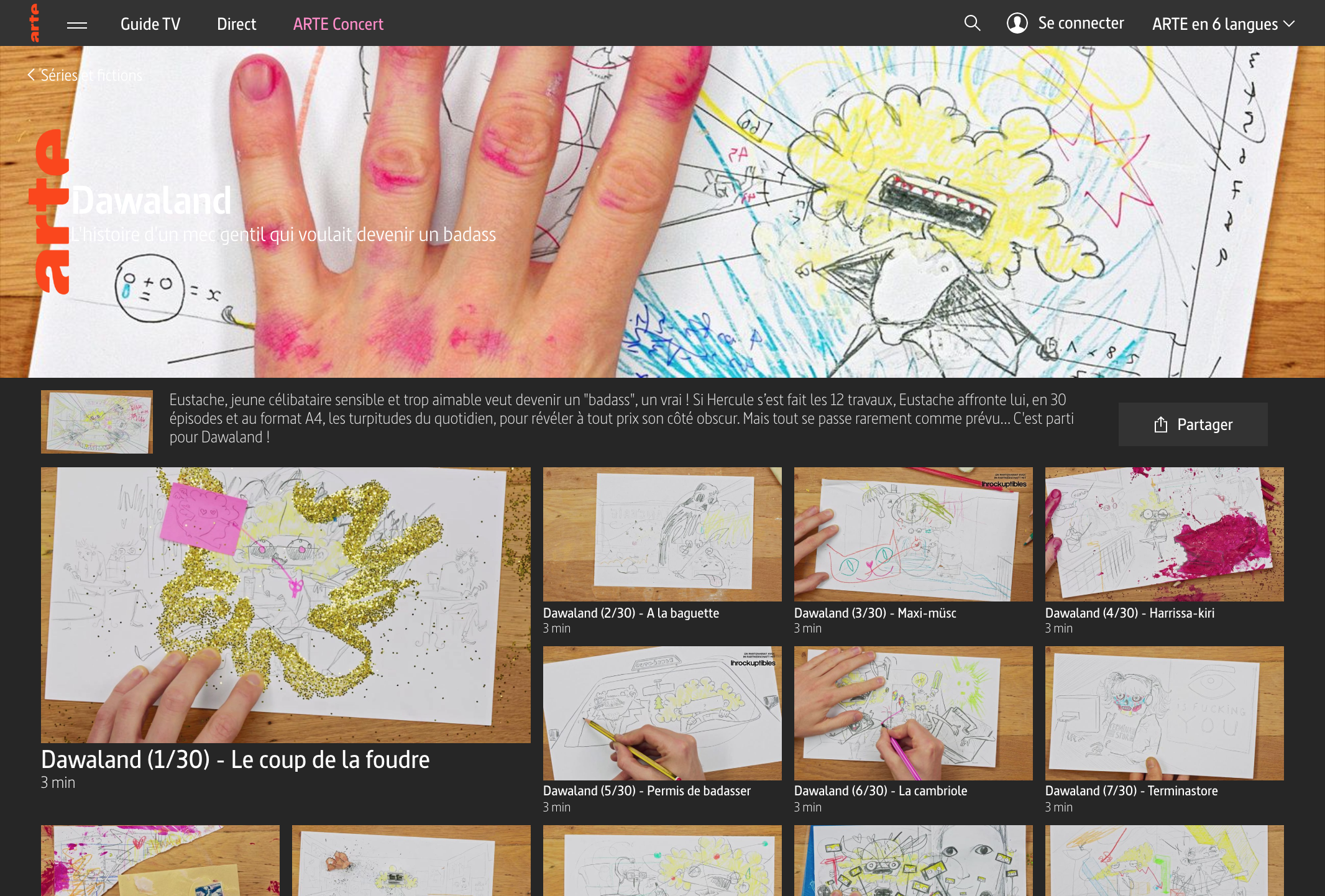 Autre expérience folle, celle de Dawaland pour Arte. Le but, raconter en 30 épisodes d’une image en création, les aventures d’Eustache, un mec gentil qui voulait devenir un badass. Un vrai hommage au travail de dessinateur. À l’écran, on ne voyait que vos mains en pleine création. En temps réel et en une prise ? Comment faisiez-vous ?