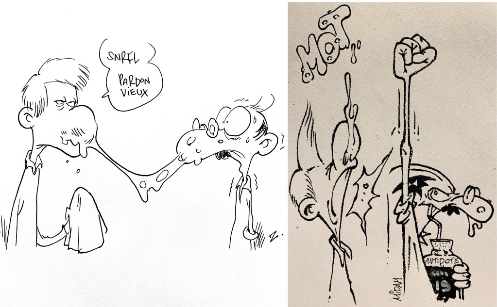 C’était sans compter l’alerte Suisse, Zep, qui a embrayé, se fendant d’un « Hummm… ça se discute » et imaginant le papa de Titeuf déjà contaminé, une gigantesque morve, à faire pâlir tous les Blorks; lui pendant au nez. Un éternuement et voilà son rival moustachu dans de sales draps.