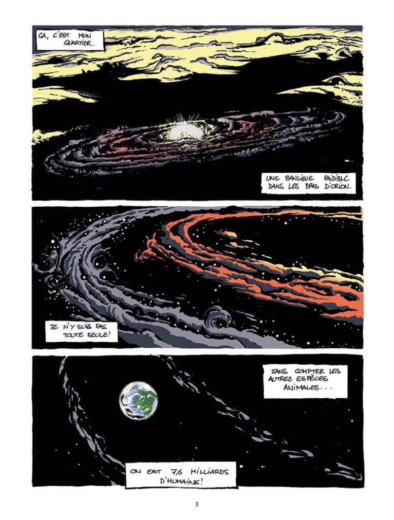 Des champs et contre champs, des plans plus larges pour resituer la scène. Des mouvements de personnages et de caméra. Je pense mes cases comme des caméras. Elles sont parfois fixes, parfois en mouvement. De plus chaque case est composée selon la règle des tiers. Je fais très attention à bien composer le récit afin de fluidifier au mieux la lecture des planches.