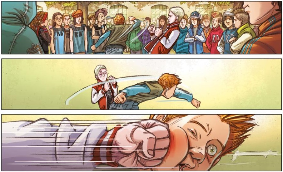 Non, chez le petit Koul, rien n’est cool. Malgré un premier tome qui a permis de décanter certaines choses, Obie découvrant un père des étoiles vachement balaise et bon conseiller pour dépasser les affronts de la vie, tout n’a pas été réglé. Que du contraire, la violence adolescente reprend de plus belle et Obie, malgré quelques fulgurances, n’est pas de taille à lutter. Ecchymoses et plaies, voilà comment notre rouquin s’en sort. Et comme les vestiges du combat lui font des cratères sur le visage, ses parents ont vite fait de se douter de quelque chose. Profitant de la garde alternée, Elzeki inscrit son fiston dans un camp d’entraînement.