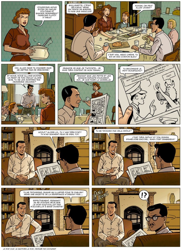 Provoquant des rencontres entre des personnages fictifs et d’autres réels, Weber et Deville nous racontent en filigrane de ce drame le destin du Soir Volé et de celui qui voulut résister. De tous ceux qui le nourrirent de leur révolte et de leur audace, de leur talent artistique. En ça, et dans les vies bouleversées de leurs personnages, les deux auteurs livrent une histoire qui prend aux tripes et qui répond totalement aux questions de ceux qui se demandent encore pourquoi faire et refaire des oeuvres sur la 2e Guerre Mondiale. Un tour du sujet ne suffit pas.