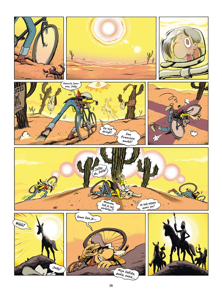 Si même Chris Froome participe au Tour de France qui s’élancera d’ici quelques jours, dans le folklore qui en découle, pourquoi ne pourrait-on pas voir un cowboy solitaire se glisser dans une échappée. Quitte à faire une infidélité à l’impétueux Jolly Jumper. De son lointain Far-West, le cowboy qui a pignon sur rue mais ne pédale peut-être pas aussi vite que son ombre ne pense pas encore au maillot jaune et se demande bien quel est l’étrange engin qu’on lui a mis dans les mains et sous les pieds. C’est le postulat, tout à fait véridique dans son onirique fiction, de Mawil, un autre Allemand (né à Berlin-Est) qui s’approprie avec brio un héros de la BD franco-belgo-universelle. Et pas le dernier.