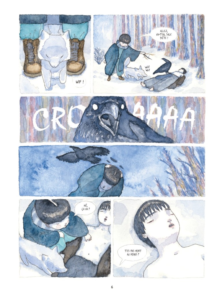 Dans Le songe du corbeau, on se retrouve face à la magie du dessin asiatique de L’atelier Sentô. Ce collectif est composé de deux illustrateurs: Olivier Pichard et Céline Brun. Travaillant à la fois sur la gravure ou les aquarelles, ce duo nous gratifie d’un graphisme doux rappelant certains album pour enfants aux lignes coréennes. Et c’est tout naturellement qu’ils ont fait appel à Alberto M.C (Martin Curto) pour mettre en lumière leur histoire. Cet illustrateur espagnol partage le même univers onirique et asiatique que notre duo.