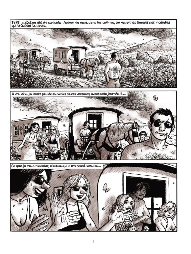 Si, aujourd’hui, j’avais continué à travailler comme dans les années 70 avec 3-4 strips par planche, je me serais épuisé. Je suis passé complètement à autre chose. Mon langage n’est plus le même, il est vraiment adulte. Pour un public intellectuellement formé. J’ai vécu le passage de la BD adolescente à celle adulte, avec l’émergence de L’Association, par exemple. À notre époque, c’est extraordinaire de voir le paysage éditorial fort. On a la chance d’être à notre époque, d’avoir la liberté fondamentale. Ici je me fais la surprise de dessiner des choses que je n’ai pas écrites. Je travaille chaque page pour être le plus précis. Les enchaînements de cases, de textes, en sont fonction. Il m’importe d’être crédible et de trouver l’osmose quand je choisis entre des bulles de dialogues et du texte off. Pour ce dernier, il faut être très précis. Il faut aussi faire jouer juste les personnages. Il y a un travail de posture, une inclinaison n’est pas l’autre. Des fois, on est plus fort sans texte. Avec l’éditeur, nous avons encore écrémé à la fin, ce qui était inutile, redondant.